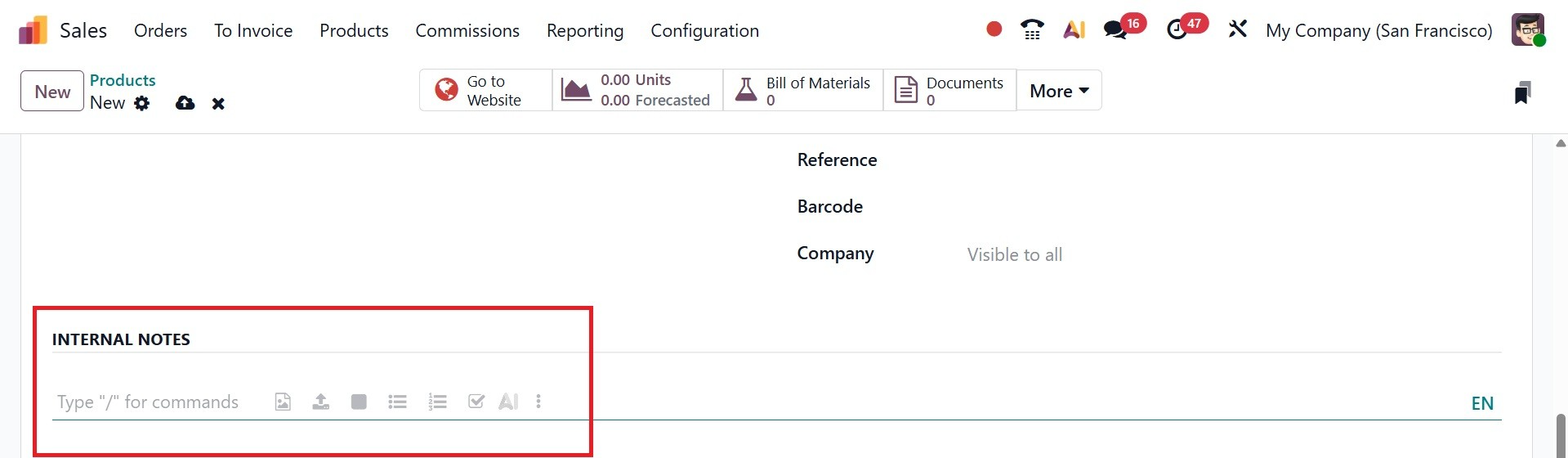 Now let's see how the Odoo 19 sales module is set up for new products. If you want to change the products that are currently available, you can select the required items from the list that is supplied and make the necessary changes. To create a new record, you are told to click the New button. A screenshot of the new product configuration window may be found below.