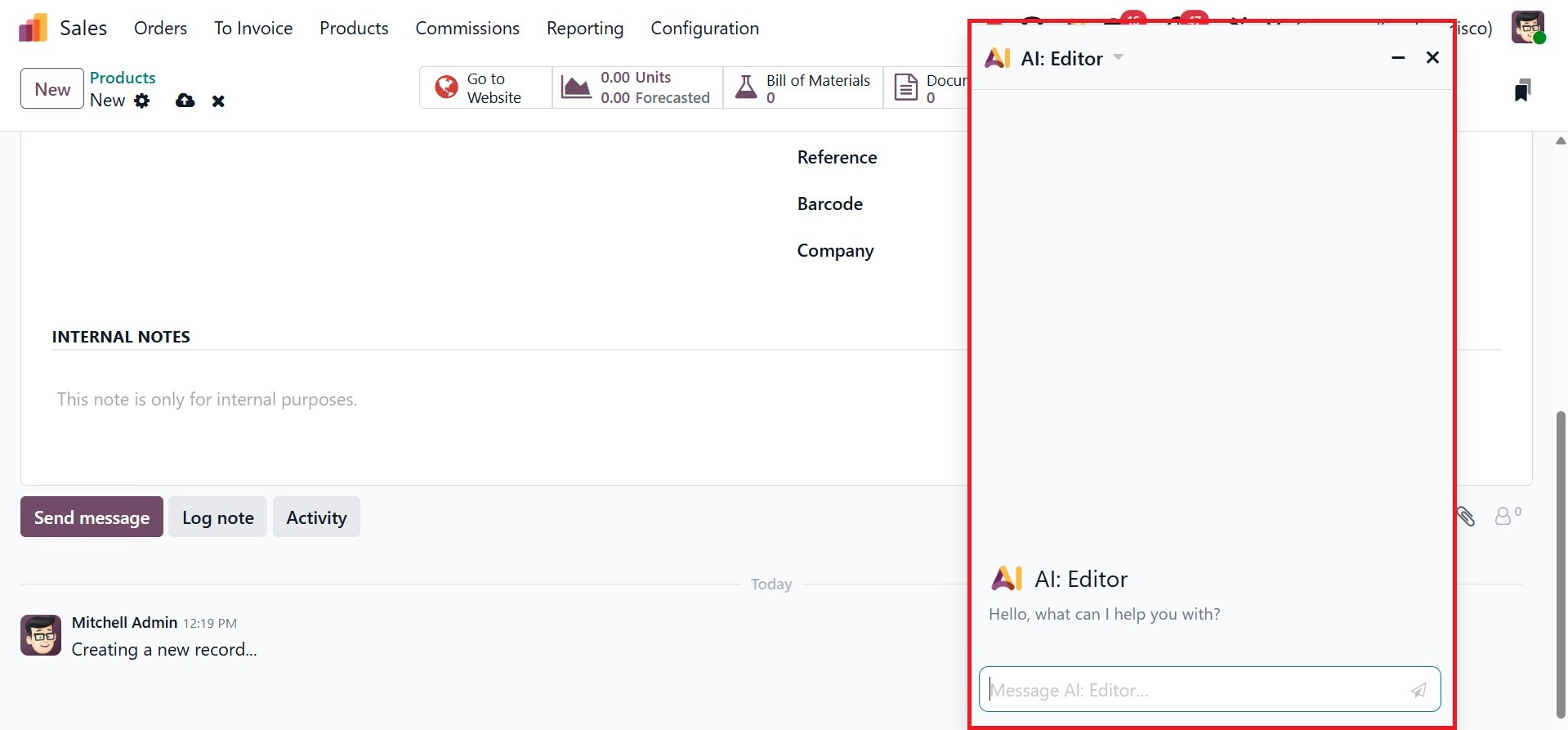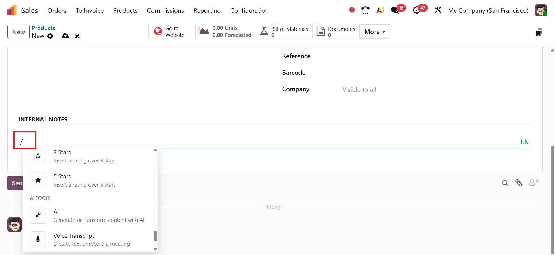 The General Information tab's Internal comments area is where you can put comments for internal use. Thus, a brand-new Chat GPT integration option was released by Odoo. Put a "/" in the internal note section to activate the Chat GPT option. This enables users to generate or edit material using AI, as in the screenshot below.