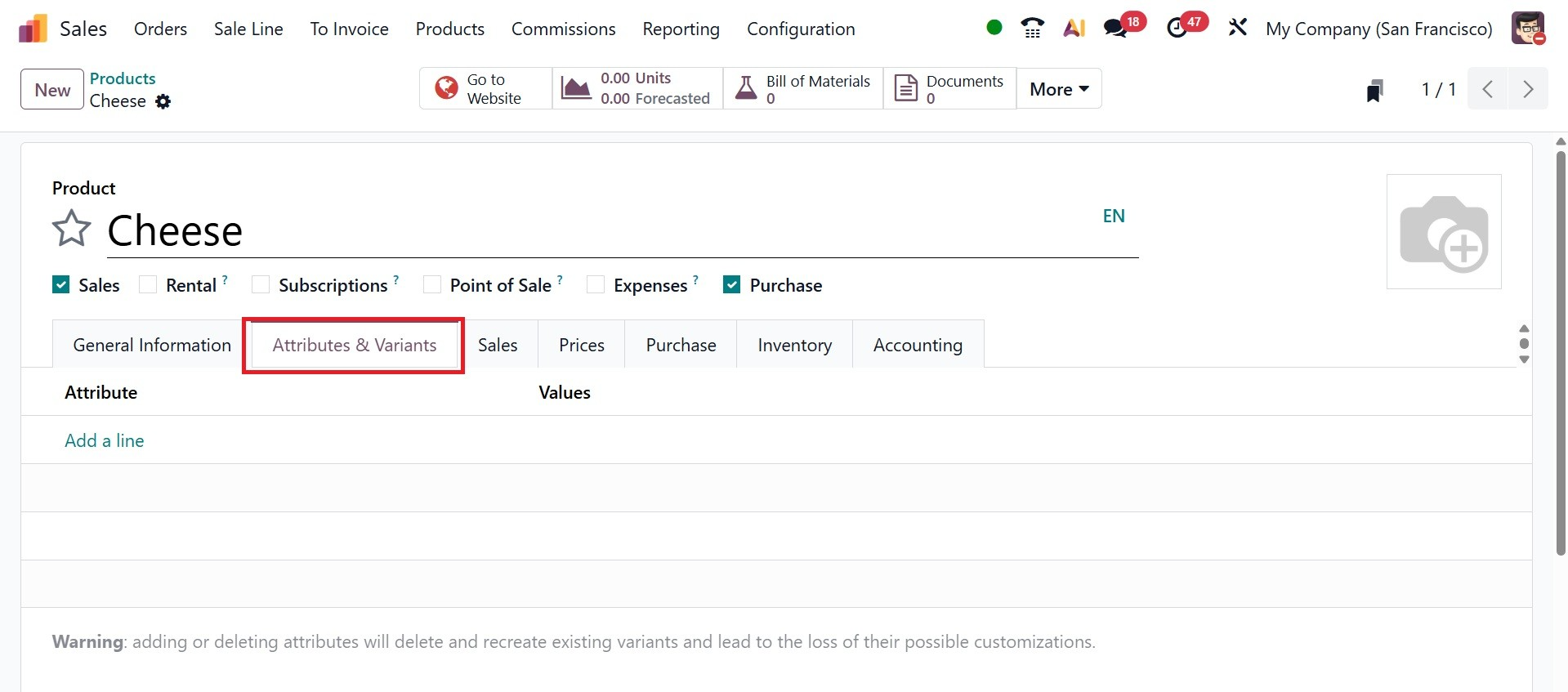 Sometimes there are multiple versions of a product, each with a unique set of features. The attributes and variations of a product can be listed under the Attributes & Variants tab.