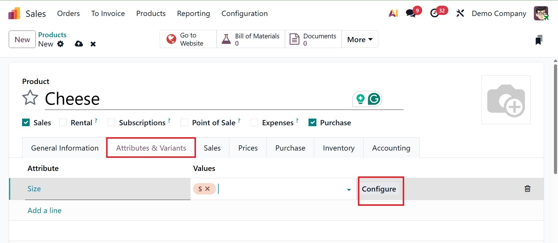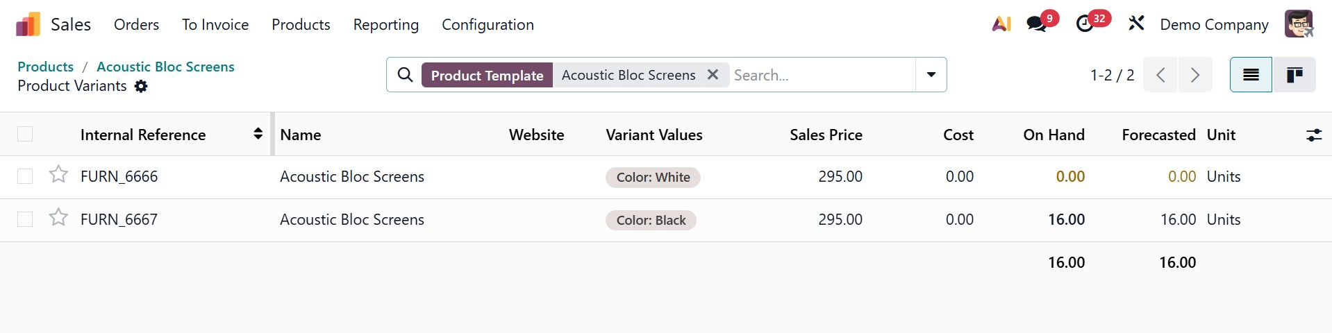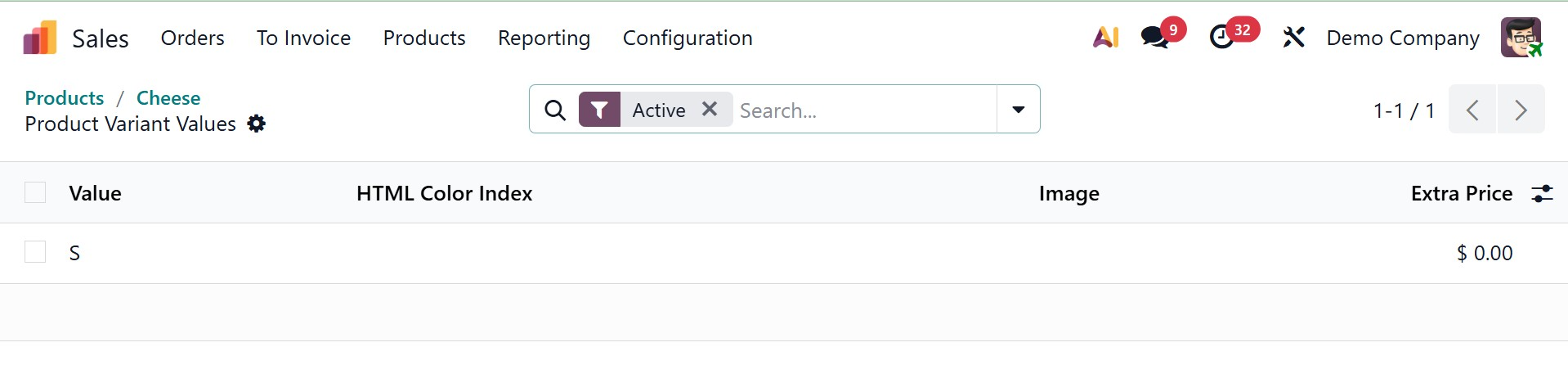 The Product Variants option under the Products menu allows you to set up new product variants in your database. A product's variant configuration is similar to the product configuration we discussed earlier.