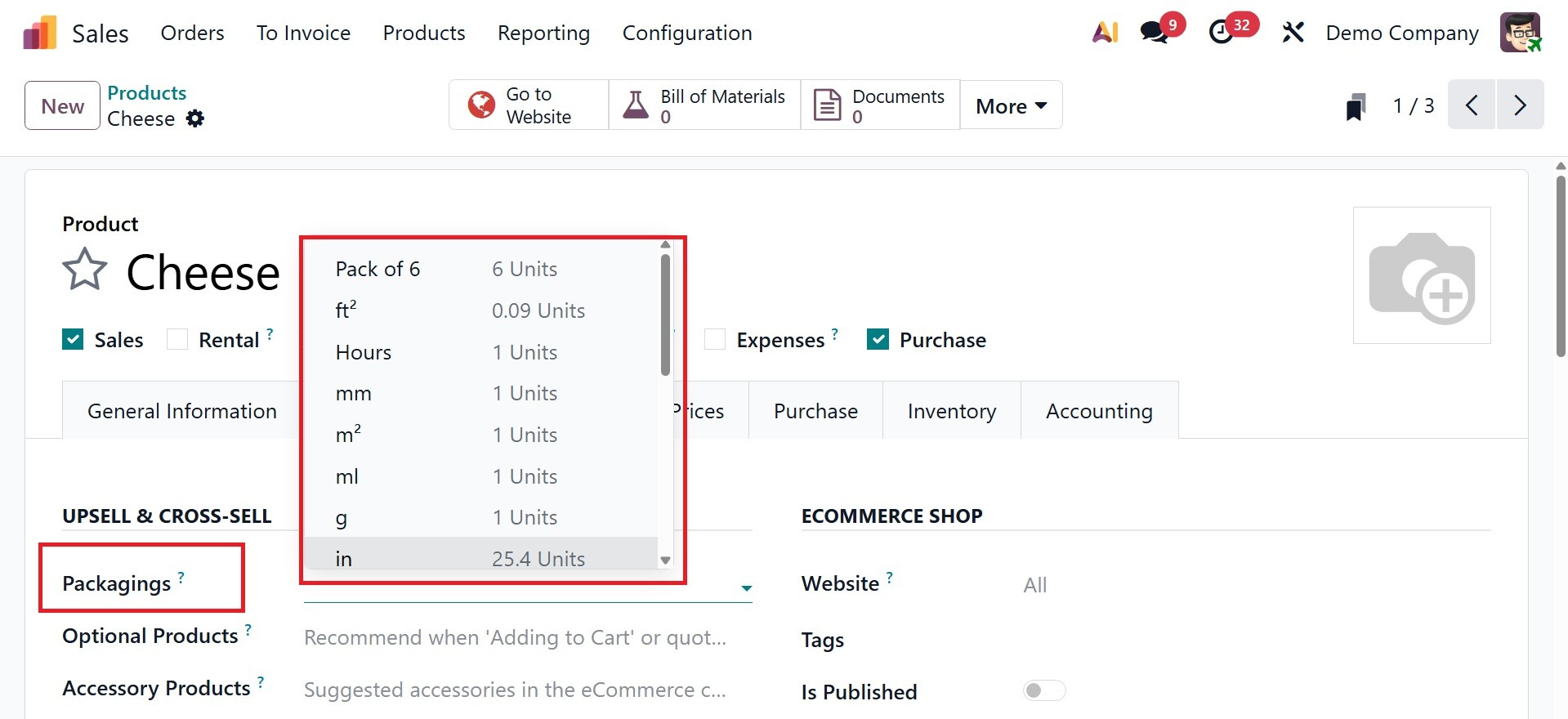 - Packaging: Combines the same products in order to sell or receive them in predetermined amounts. Here, you can add the units along with the packaging details, which is new in Odoo 19.