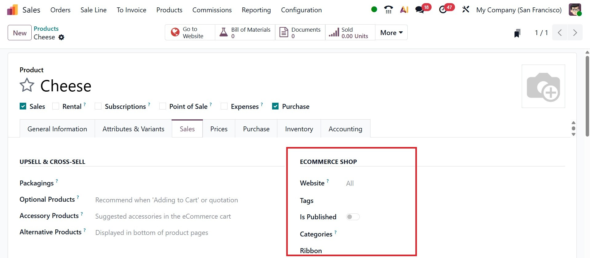 Sales data for the new product will be available on the Sales tab of the product setup window. You can specify your eCommerce shop, point of sale, and upselling and cross-selling strategies in this section. The screenshot below shows the Sales tab for a product. Under the Upsell & Cross-Sell box, you can designate Alternative Products, Accessory Products, and Optional Products in the appropriate positions.