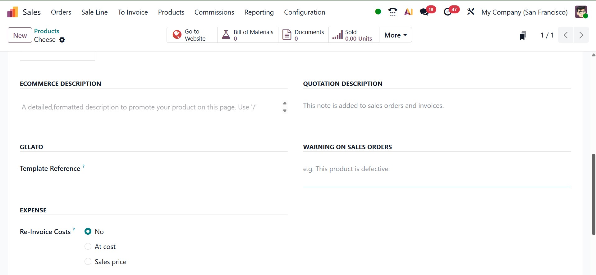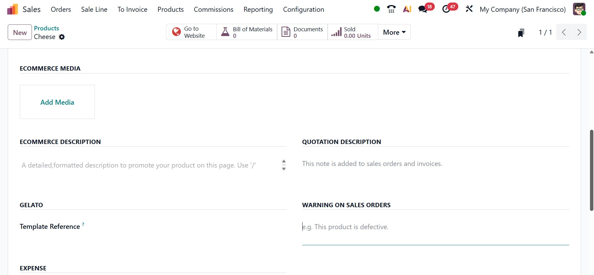Using the ECOMMERCE DESCRIPTION column, you may add ecommerce-related notes that will appear on the sales orders and invoices for this particular product. The QUOTATION DESCRIPTION is added to the sales orders and invoices. Under the GELATO, you can add a template reference.
