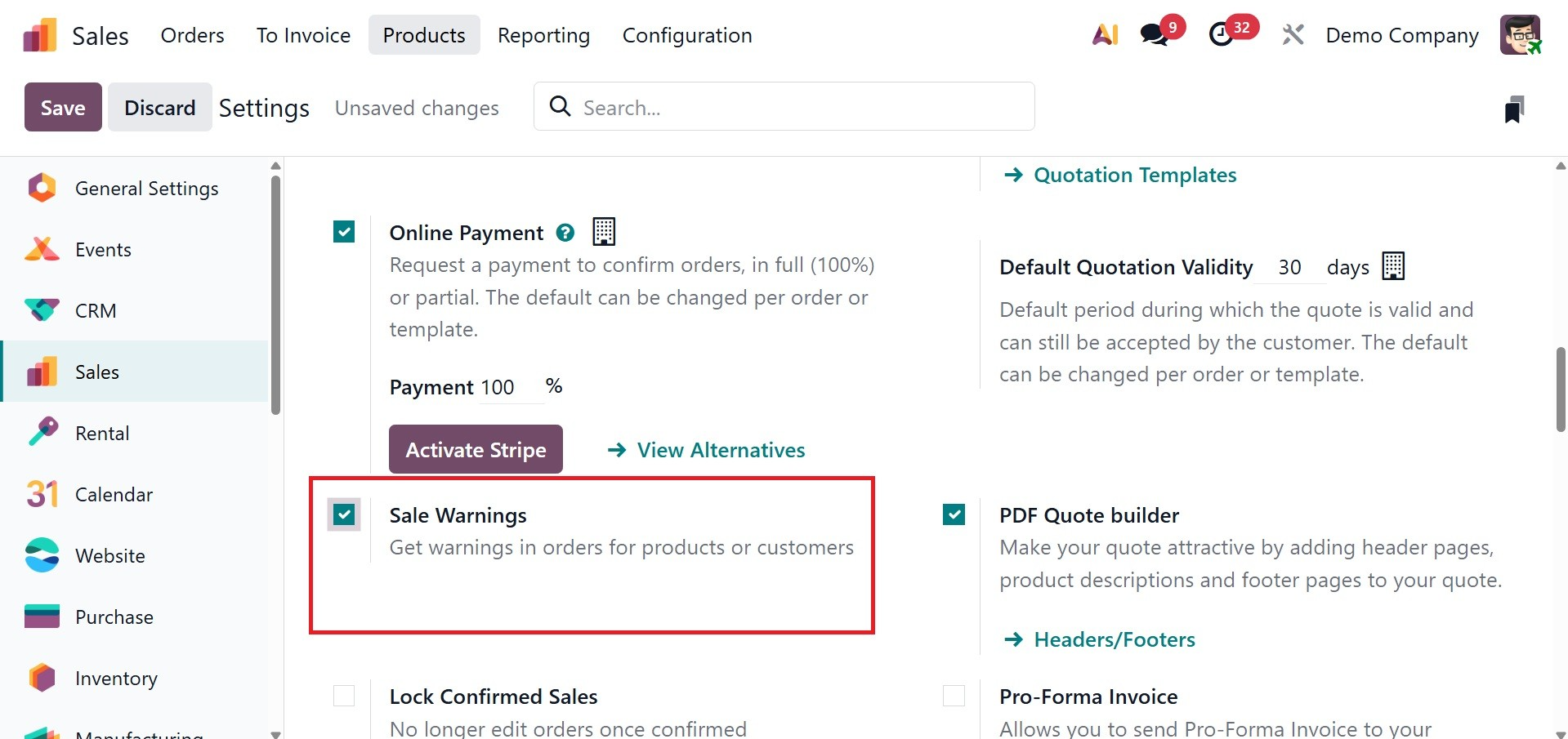 You have the option to create product warning messages in Odoo 19. You can activate this feature from the Settings menu in the Sales module.
