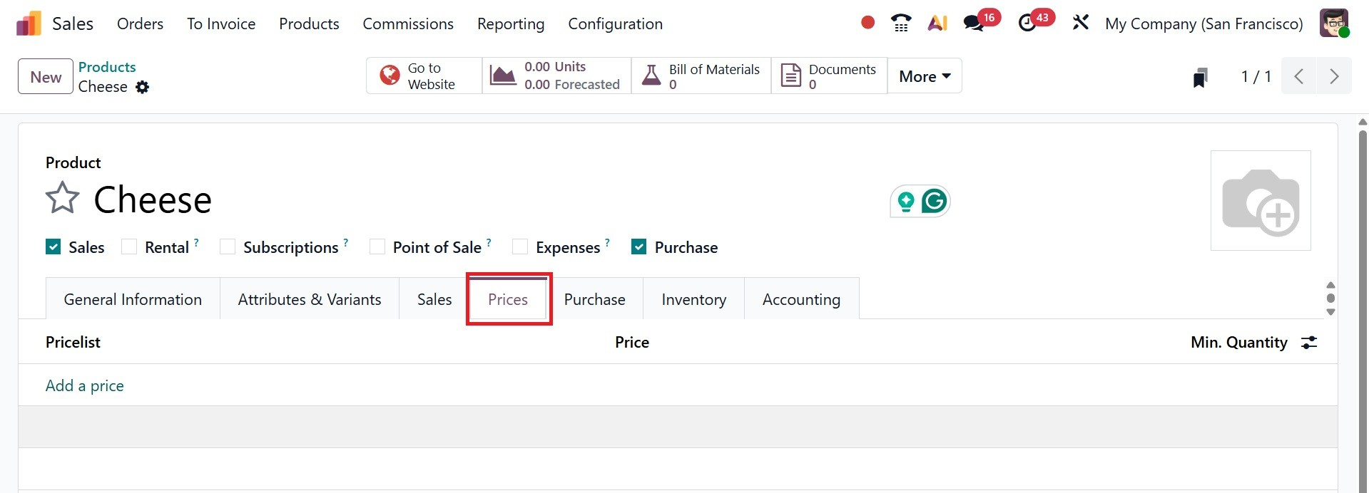 Now, the next tab is Prices, which can be used to add the price list, as in the screenshot below. Which is a new feature in Odoo 19.