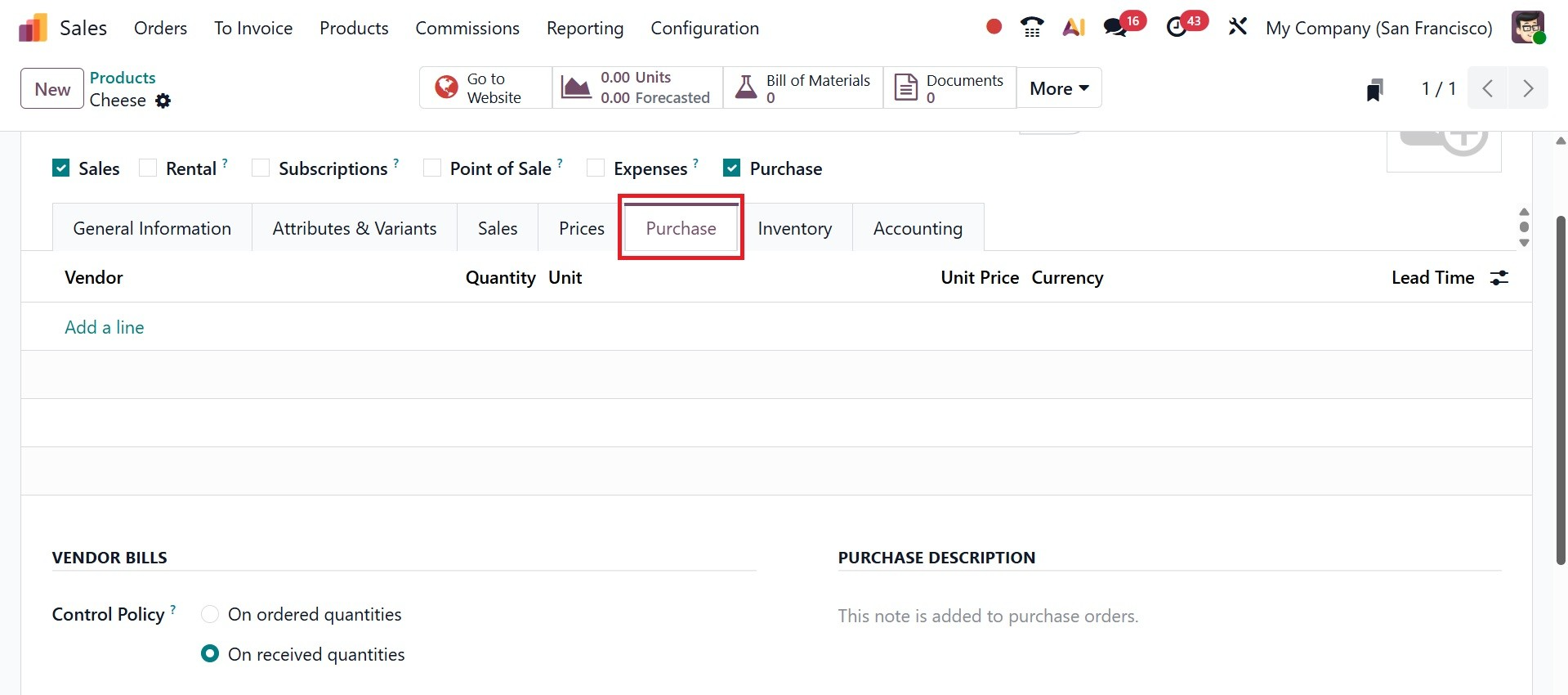 - Purchase: Makes it possible to buy the product using the Purchase module. It can be included in purchase order for vendors.