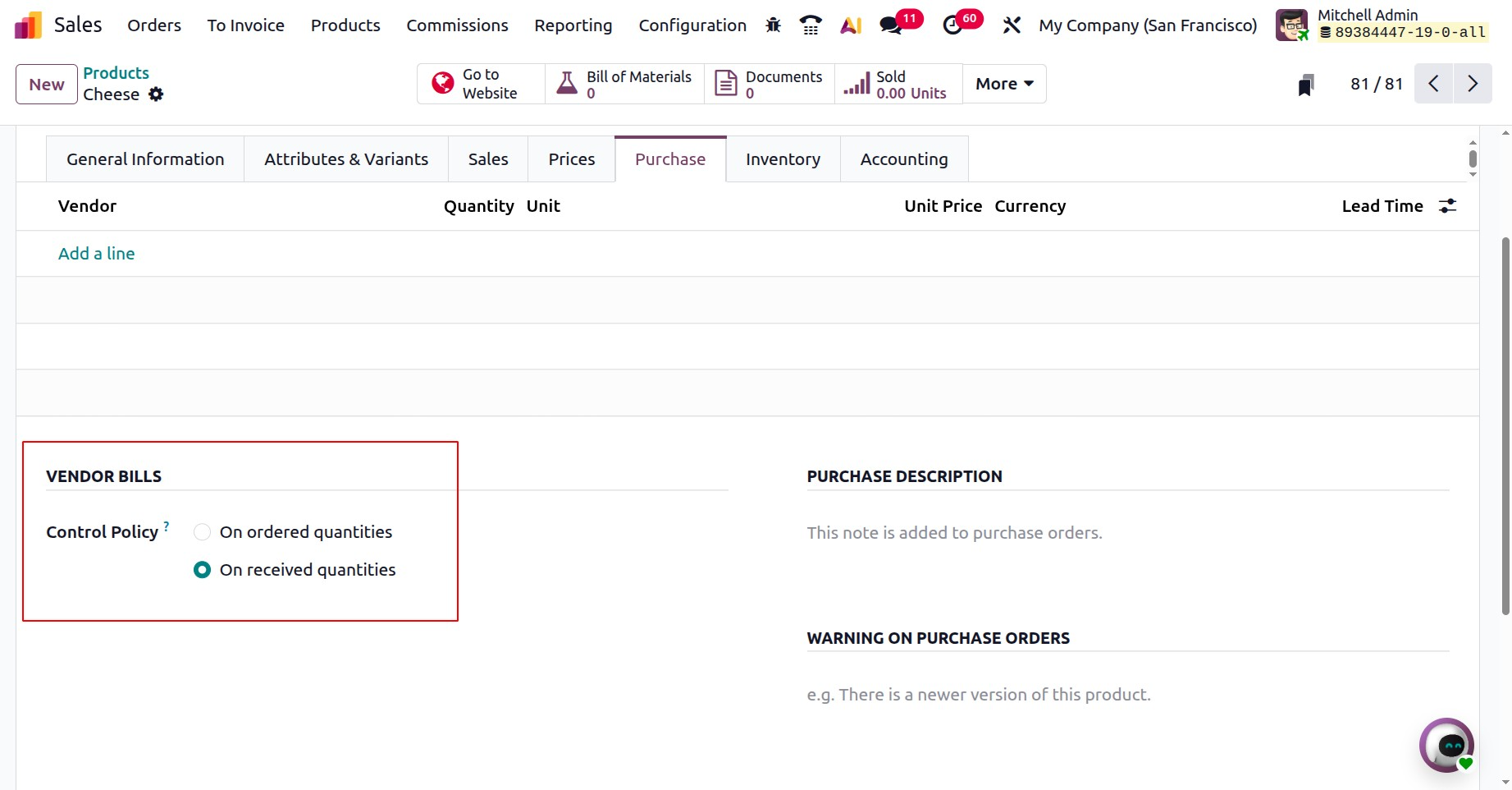 Either ordered quantities or received quantities can be set up in the Control policy, which will control bills according to those amounts. The notes entered in the Purchase Description section will be added to purchase orders.