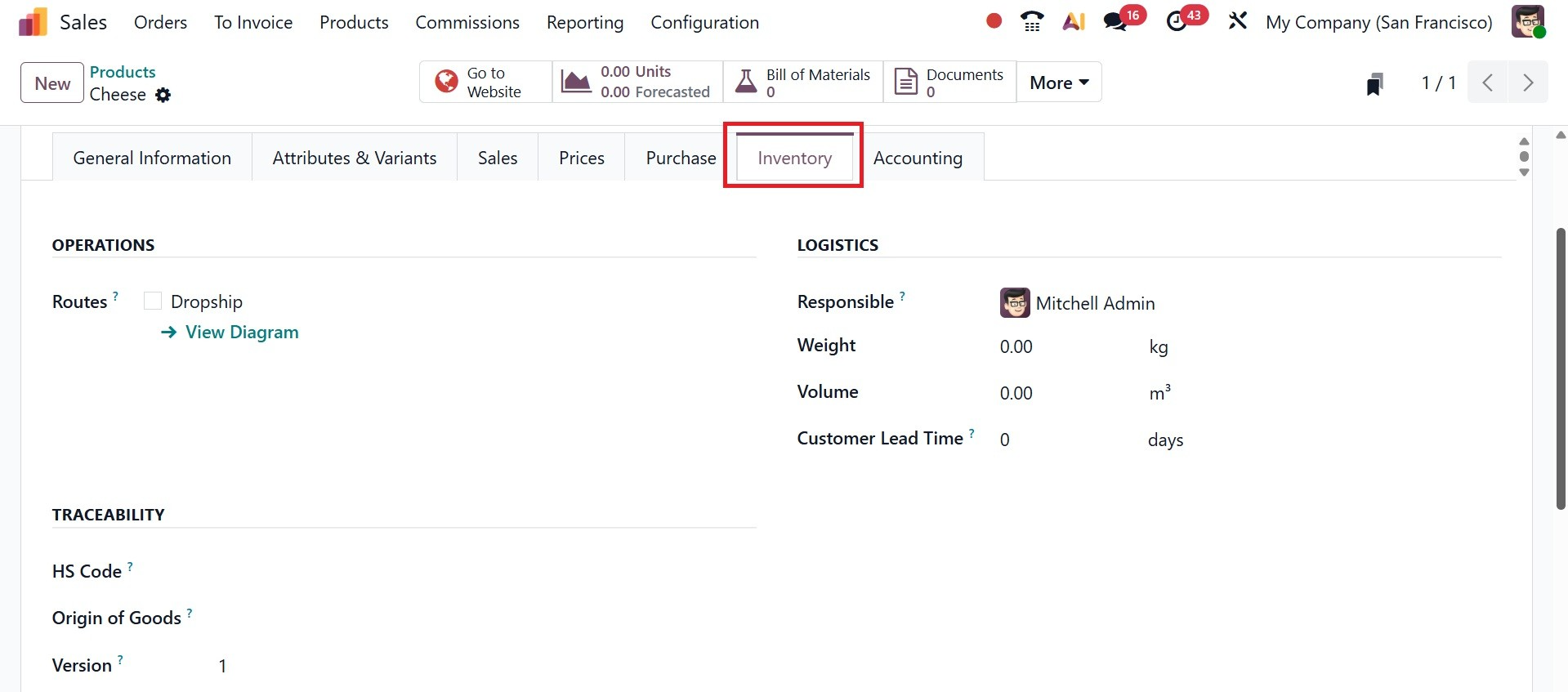 As can be seen, the information required to manage the product's inventory will be found on the Inventory tab of the product setup window. You can select from the options offered for the routes of operation of the particular product. This will allow you to specify the path of the product according to the modules loaded in your database. A user might be mentioned in the Logistics field's Responsible section. This user will be responsible for the following tasks related to the product's logistical operations. In the respective sections, you can enter the product's weight, volume, and customer lead time.