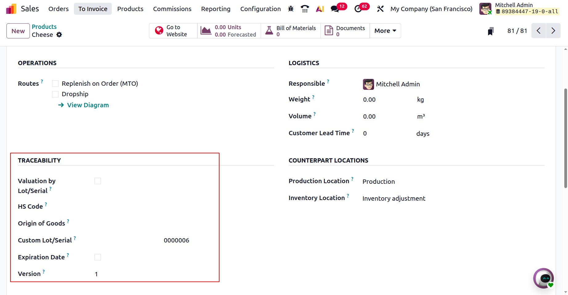 In the Traceability field, mention the HS Code, a standardized identification for international shipping and product declaration. FedEx is the only shipping company that uses it at the moment. The Origin of Goods field will show where the items originated, which is the place where they were manufactured, rather than where they were sent. You can also mention the Version as well. Here, there are some extra fields like Valuation by Lot/Serial, Custom Lot/Serial, which are new under Odoo 19.