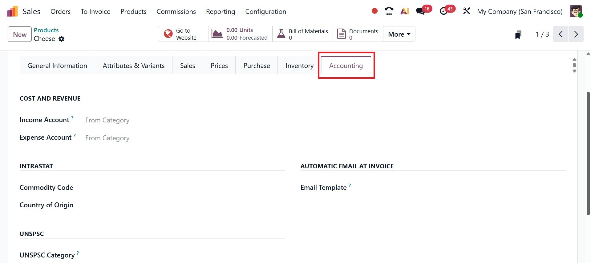 The Accounting tab will be helpful in monitoring the financial details of a product. The Cost and Revenue section allows you to select the Income Account and the Expense Account. The Intrastat box allows you to enter the Country of Origin and Commodity Code.