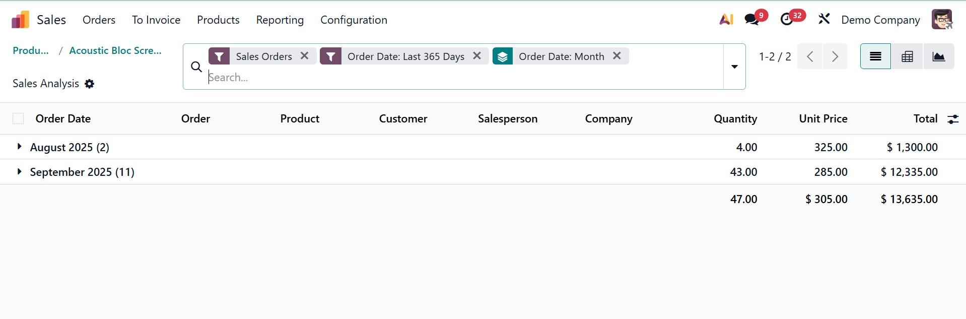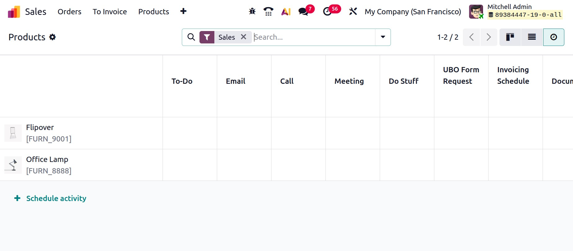 Odoo 19 has changed the Kanban view symbol, much like what we saw in the CRM module. You will have access to the Activity view on this platform, which shows a list of the activities planned for different sales-related operations for different items, in addition to the kanban and list views.