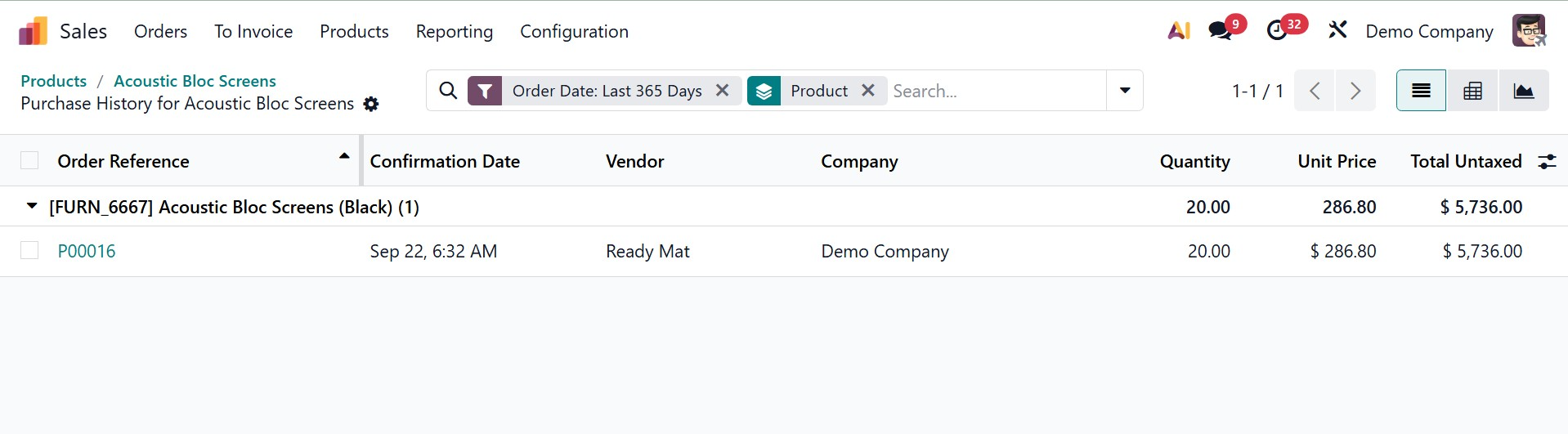 - Purchased – Displays purchase data, showing how many times the product has been bought from vendors, as in the image below.