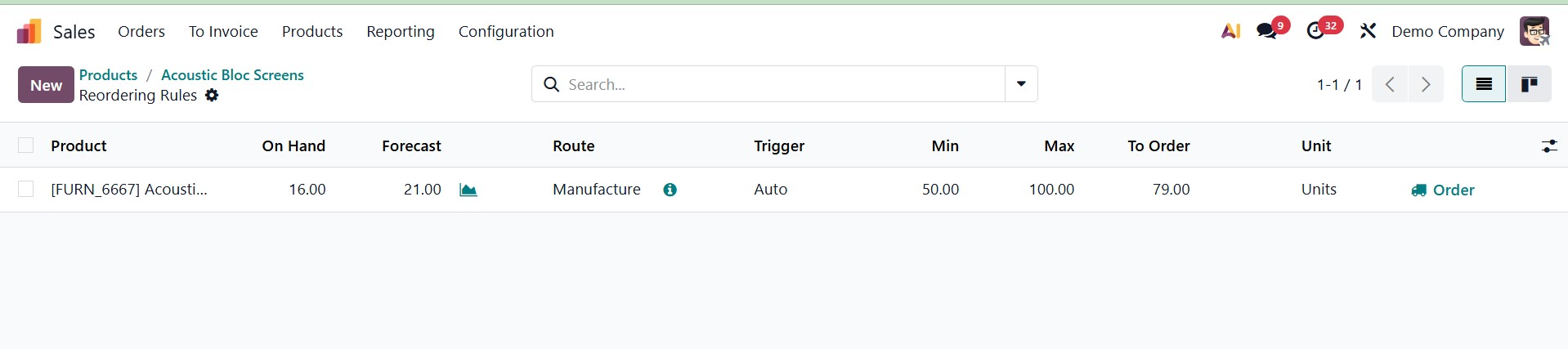 - Reordering Rules –Shows the rules set to automatically reorder the product when stock is low.