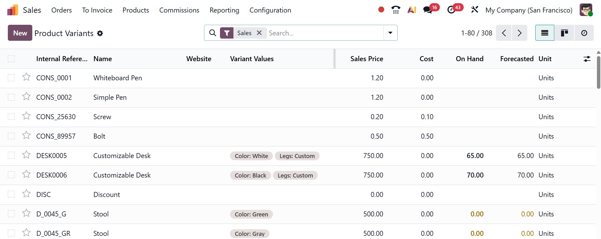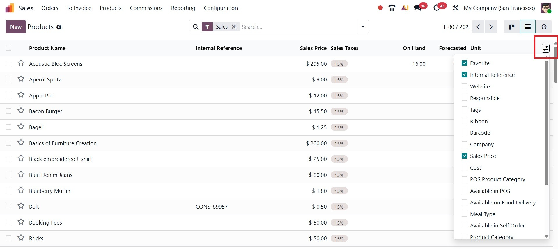 The List view of the product window provides specific information on the Product Name, Internal Reference, Sales Price, Sales taxes, On Hand, forecasted, and Unit. You can add more default fields and custom fields to the list view by using the icon in the window's right corner, as seen in the screenshot above.