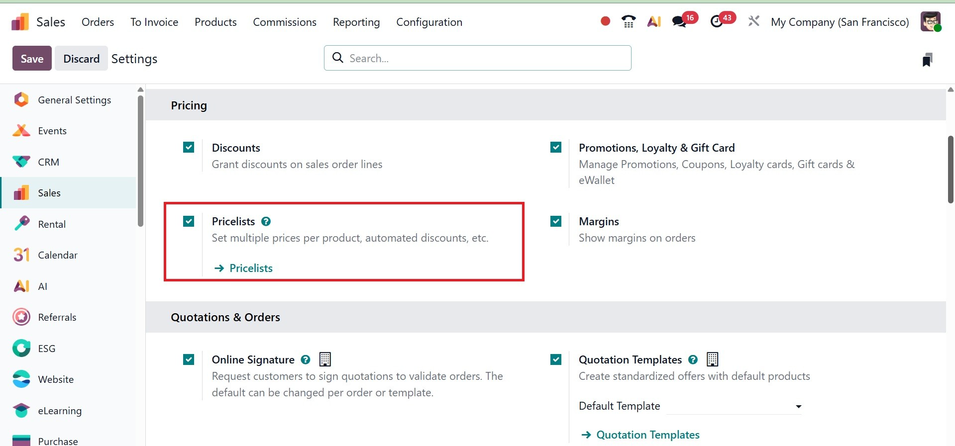 To access the platform where new price lists can be configured, you must enable the relevant feature from the Sales module's Settings menu. The Pricelists function can be instantly activated from the Pricing page, as shown in the image below.