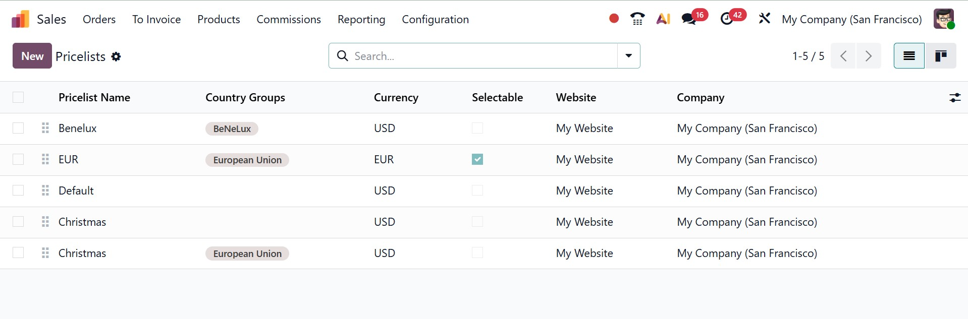 This platform's list view shows the Pricelist Name, Country Groups, Currency, Selectable, Website, and Company data.