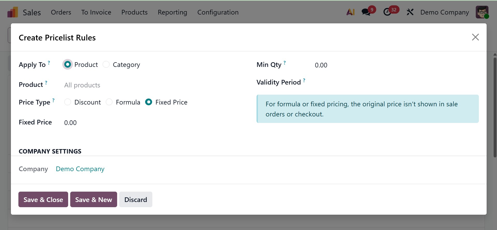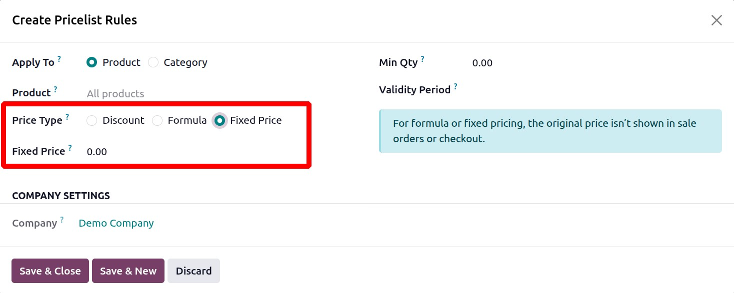 - Fixed Price: For this price list, provide the set price. This pricing will be applied to all product lines in the quotation form.