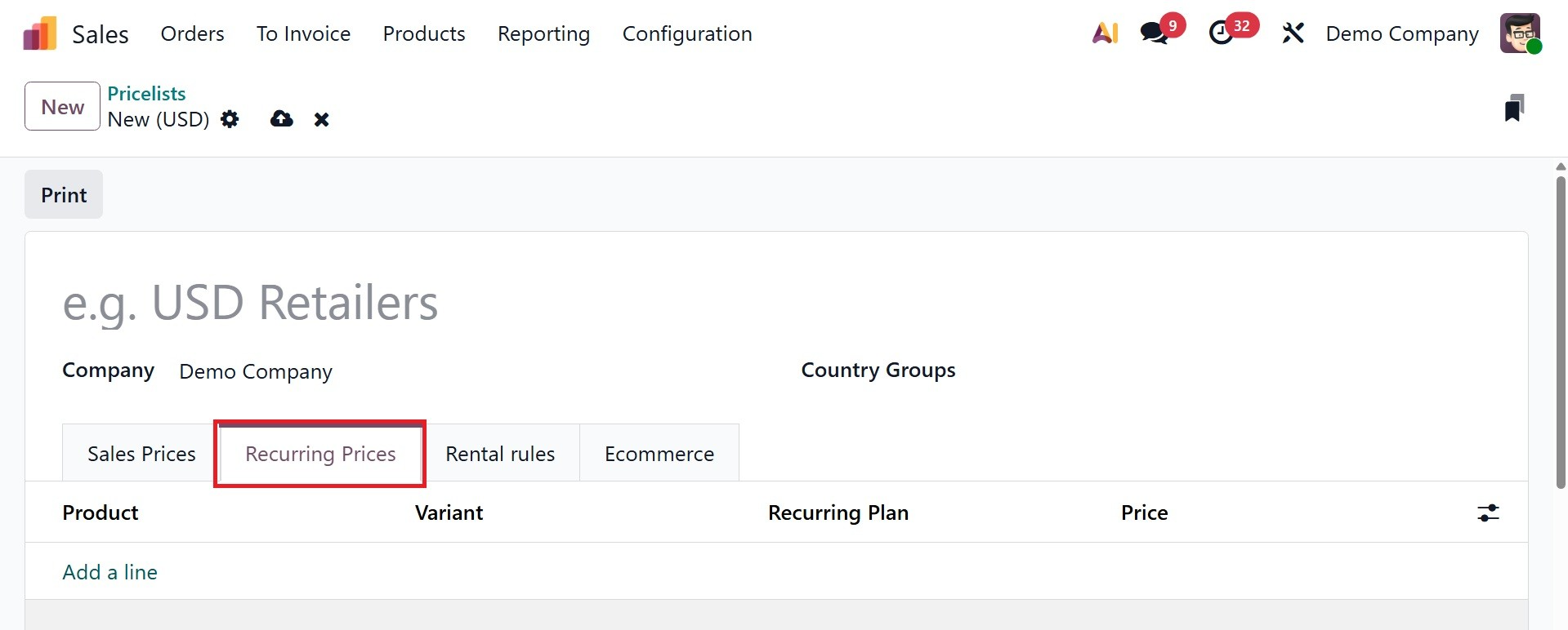Pricelists are set up using the same options as in the Price Rules page under the Recurring Prices tab, but with extra columns for Product Variants and Recurring Plan. Actually these are used for Subscription. Product variations are set up under items with one or more characteristics, like size, color, etc. If applicable, choose the desired product variants to be included in the price rule after a product has been chosen under the Products Tab. Next, a drop-down menu with pre-designated recurrence periods will appear when you pick the blank entry in the Recurring Plan column. Finally, in the recurring Price column, enter the desired price for this recurring price rule.