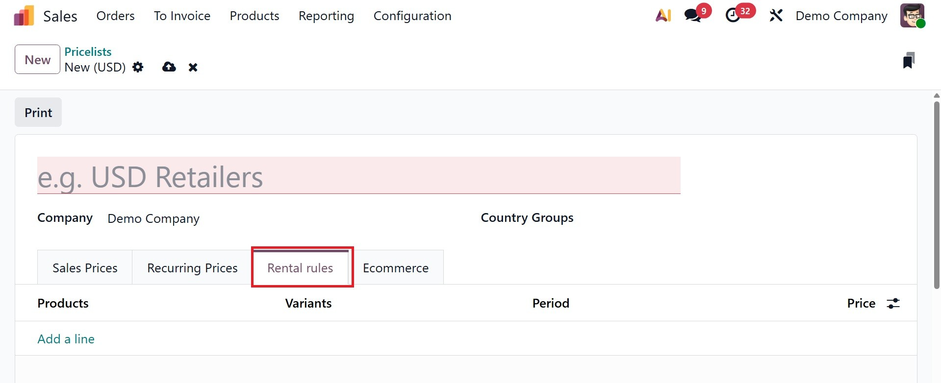 Click Add a line and choose a product in the Products column to add a rental rule. Then, if required, choose any particular variants. Next, decide on a time frame (daily, hourly, etc.) for the renting regulation. Finally, set a price in the corresponding column for the rental rule.