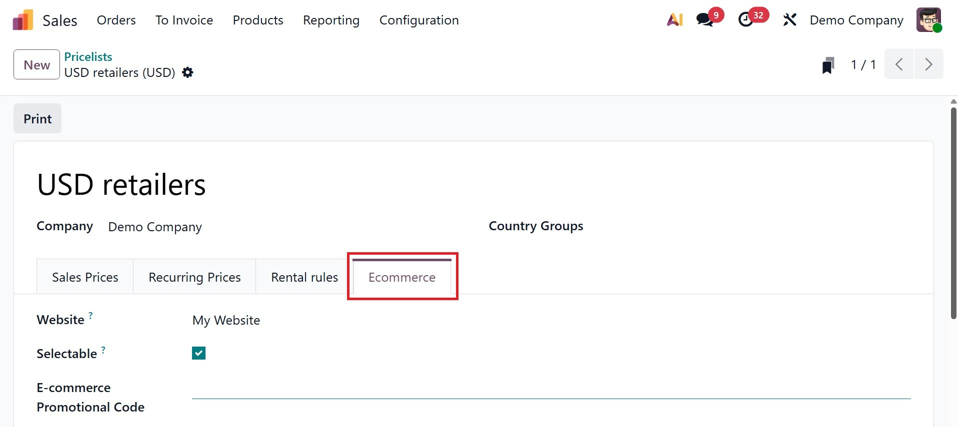 Finally, you have an ecommerce tab. Price regulations for goods sold on an e-commerce website can be set up under the Ecommerce tab. Choose the target website in the Website section to make the price list visible. When Selectable option is enabled for a pricelist, it allows users to actively select it for their purchases, making the pricelist available for public use, whereas if it's unchecked, only the default or assigned pricelist is visible. To make this pricelist a selectable option for customers to pick from while they shop, tick the Selectable checkbox.