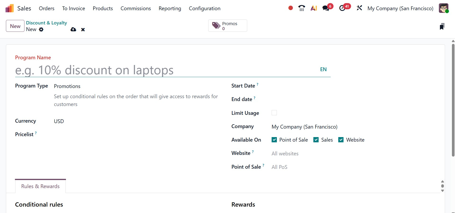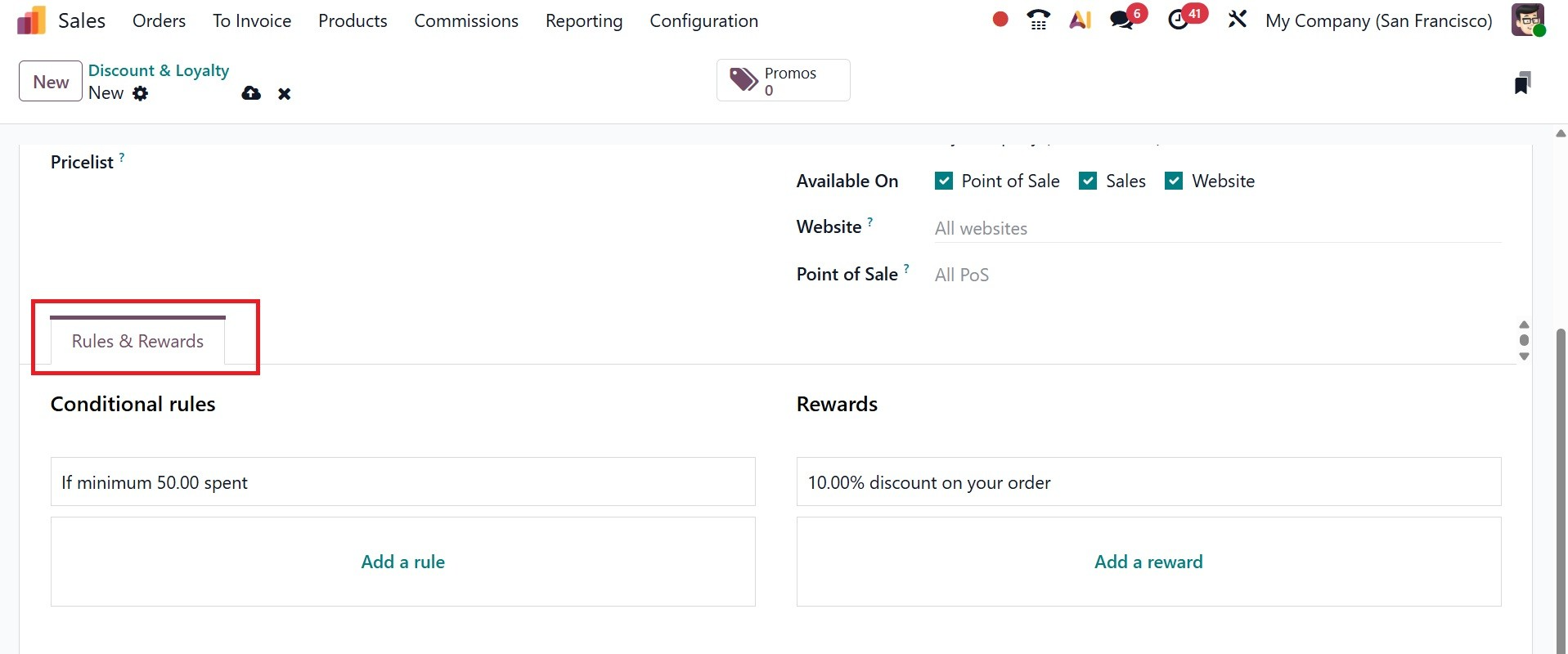 y program applied to a particular pricelist (and customers related to the pricelist), choose a pricelist from the drop-down menu if you'd like. In this area, you can choose from many pricelists. It is feasible for various consumer segments to have distinct pricelists but the same loyalty programs when a single loyalty program is connected to several pricelists. The program is applicable to everyone, regardless of pricelist, if this field is left empty.