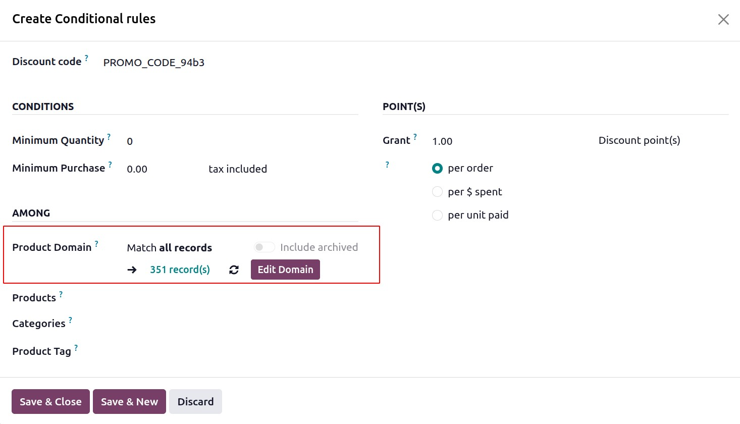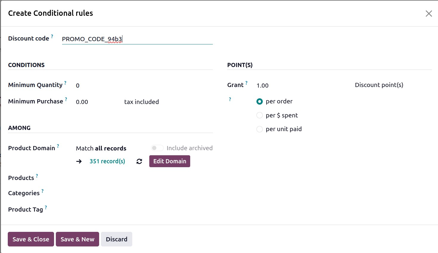 - Discount Code: Use the default code that Odoo generates or enter a custom code to be used for the Discount Code program. Only when the Program Type is set to Discount Code is this field accessible.