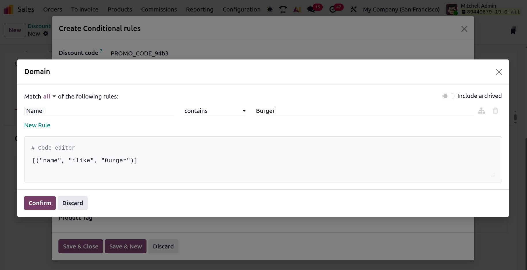 By using this users can add rules, and according to that rule the reward will get. For example the given rule here is Name contains Burger. So the product name should contain the word Burger on it to get the reward. Click on the confirm button then.
