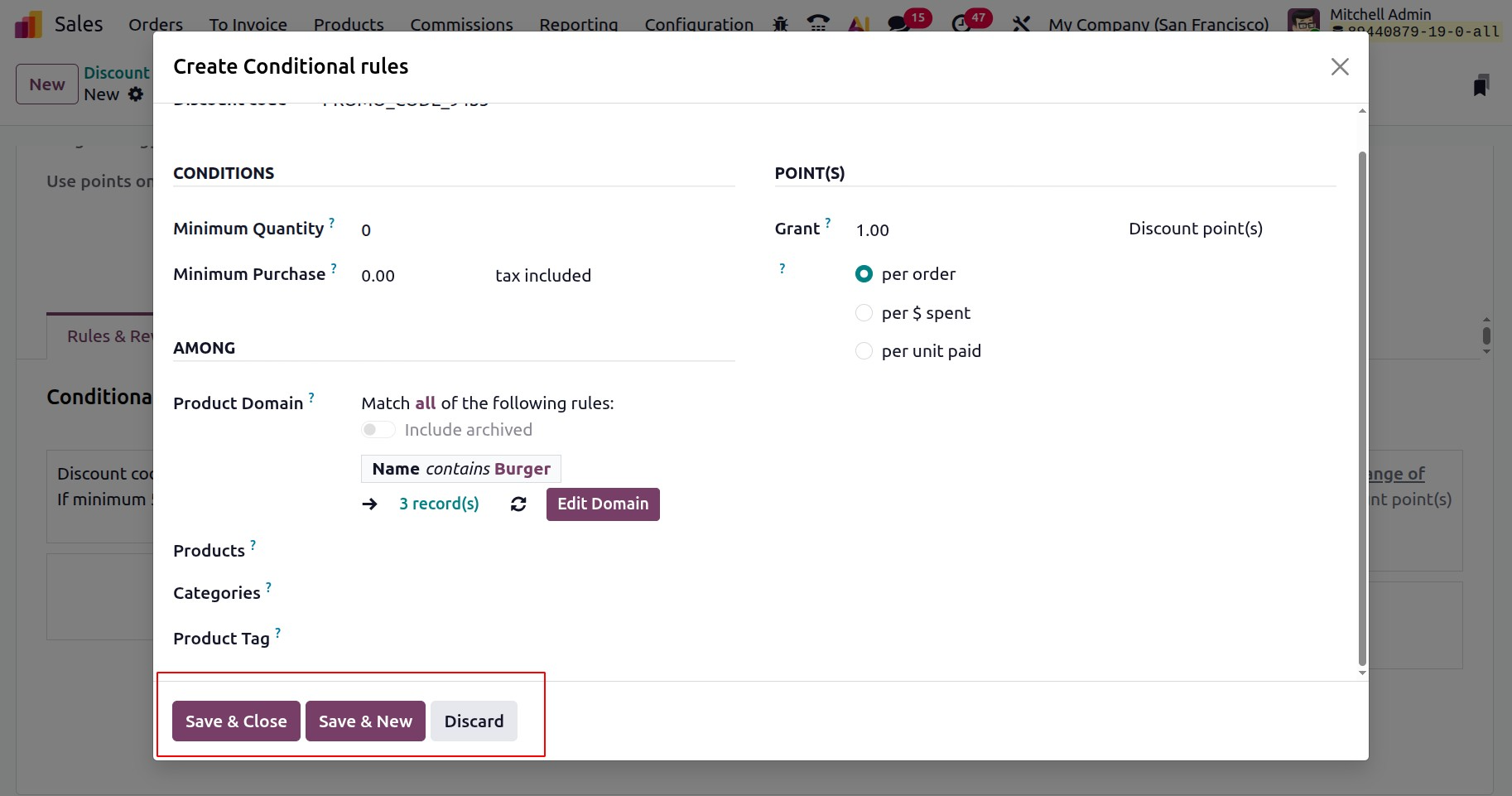 - Discount: Type in the amount that has been reduced as a percentage, currency per order, or currency per point. Next, choose if the discount is applied to Order, Cheapest Product, or Specific Product.