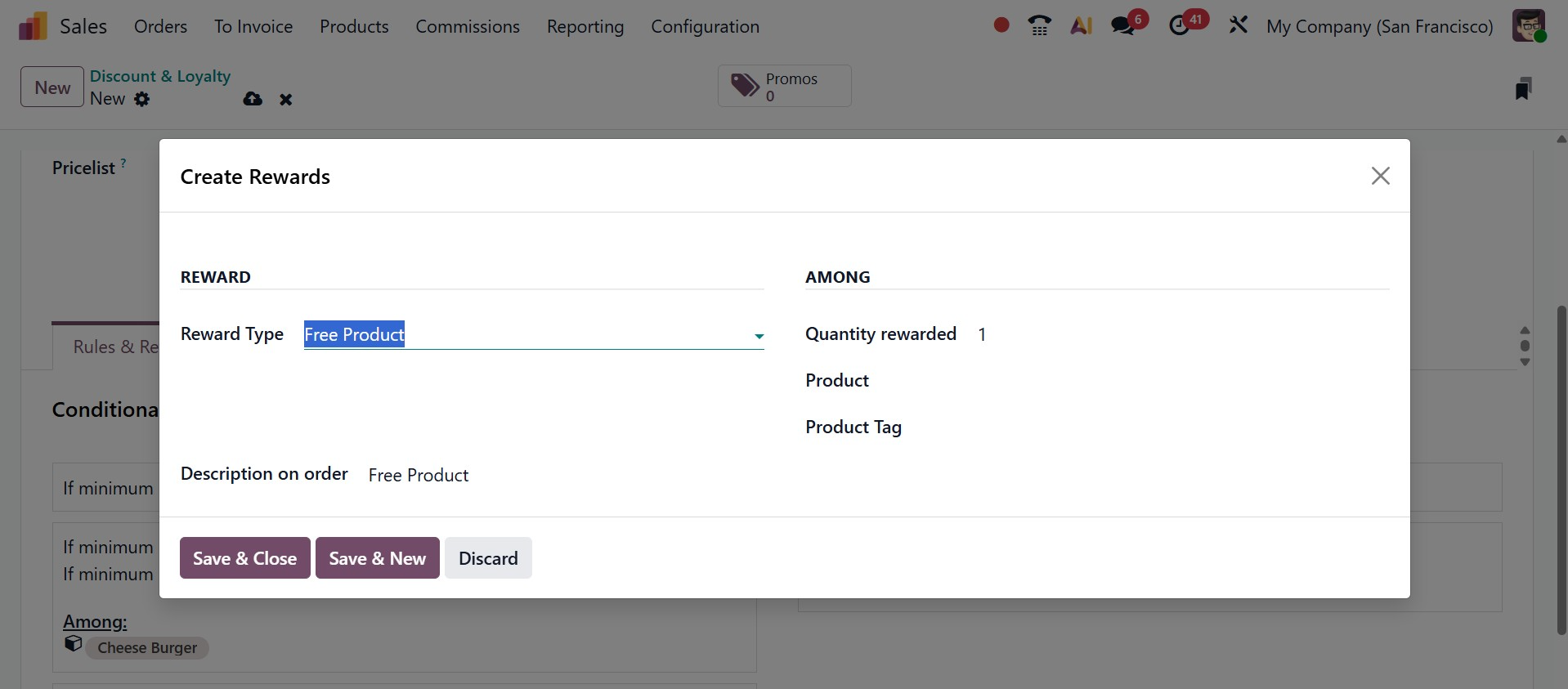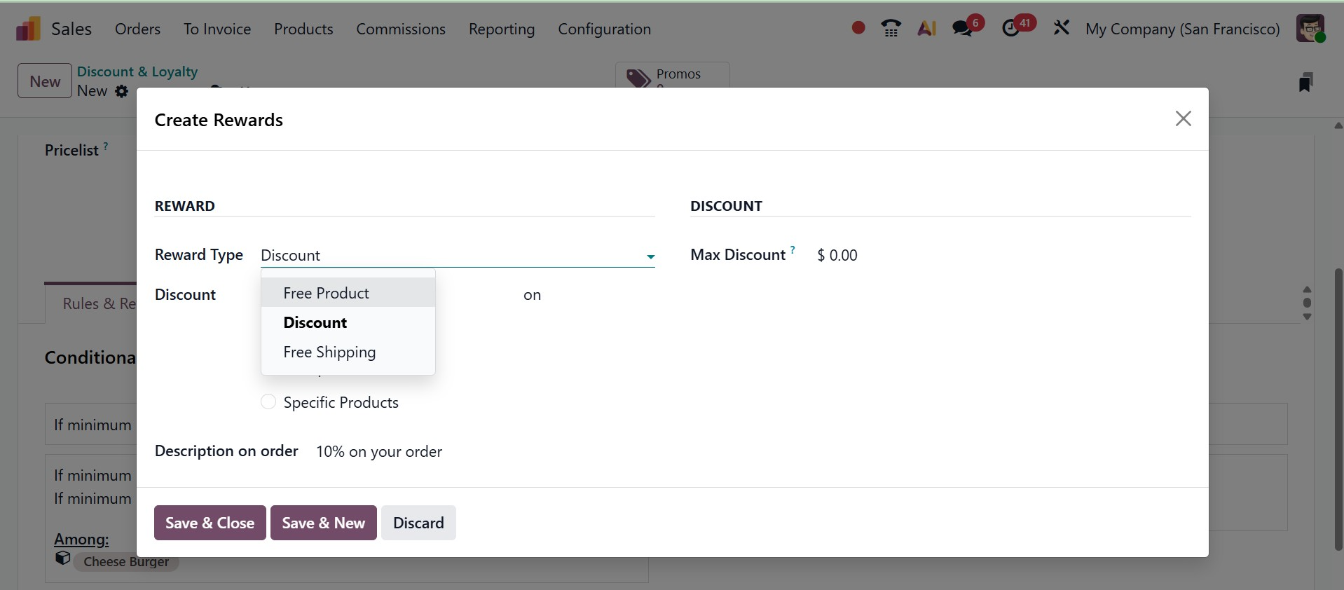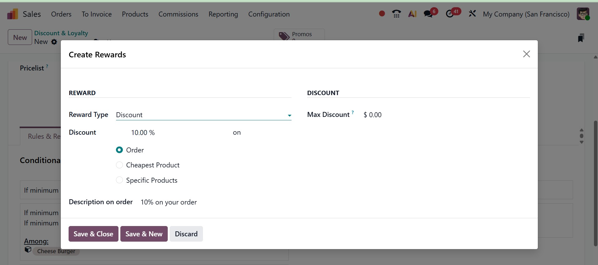 - Description on Order: a user-defined text message that appears on the customer's sales order when a discount, loyalty program, or other reward is applied.