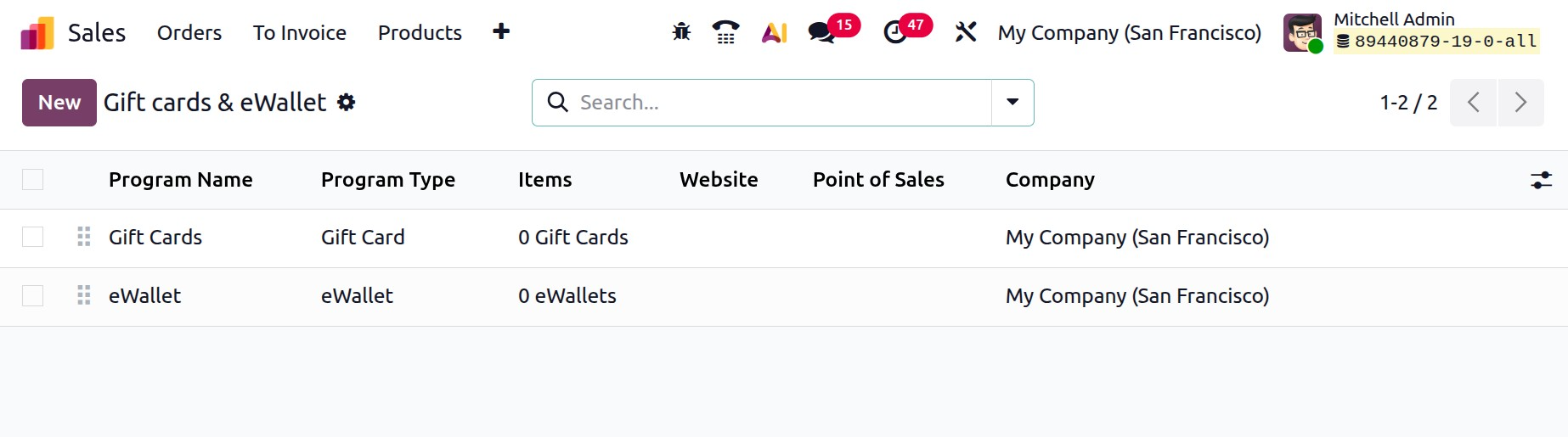 A new feature in Odoo 19 is a menu specifically designed for managing eWallets and gift cards. The new Odoo 19 Sales module offers access to the eWallet's features. As seen in the screenshot below, the platform shows a list of gift cards and eWallets together with details about the Program Name, Program Type, Name, Website, PoS Configuration, and Company.