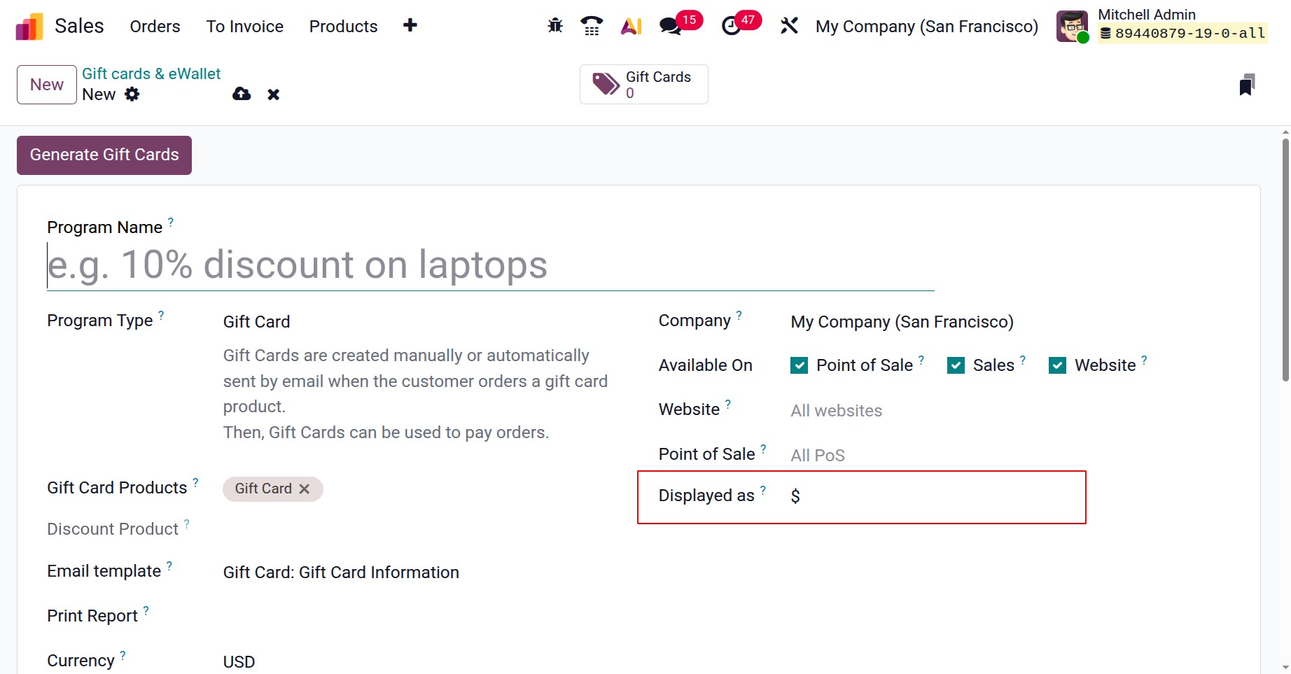 - Displayed as:within the Sales Gift Cards and eWallets feature defines the unit of value presented to the customer. It provides a customizable label to make the gift card or eWallet value more meaningful and relevant to your customers.