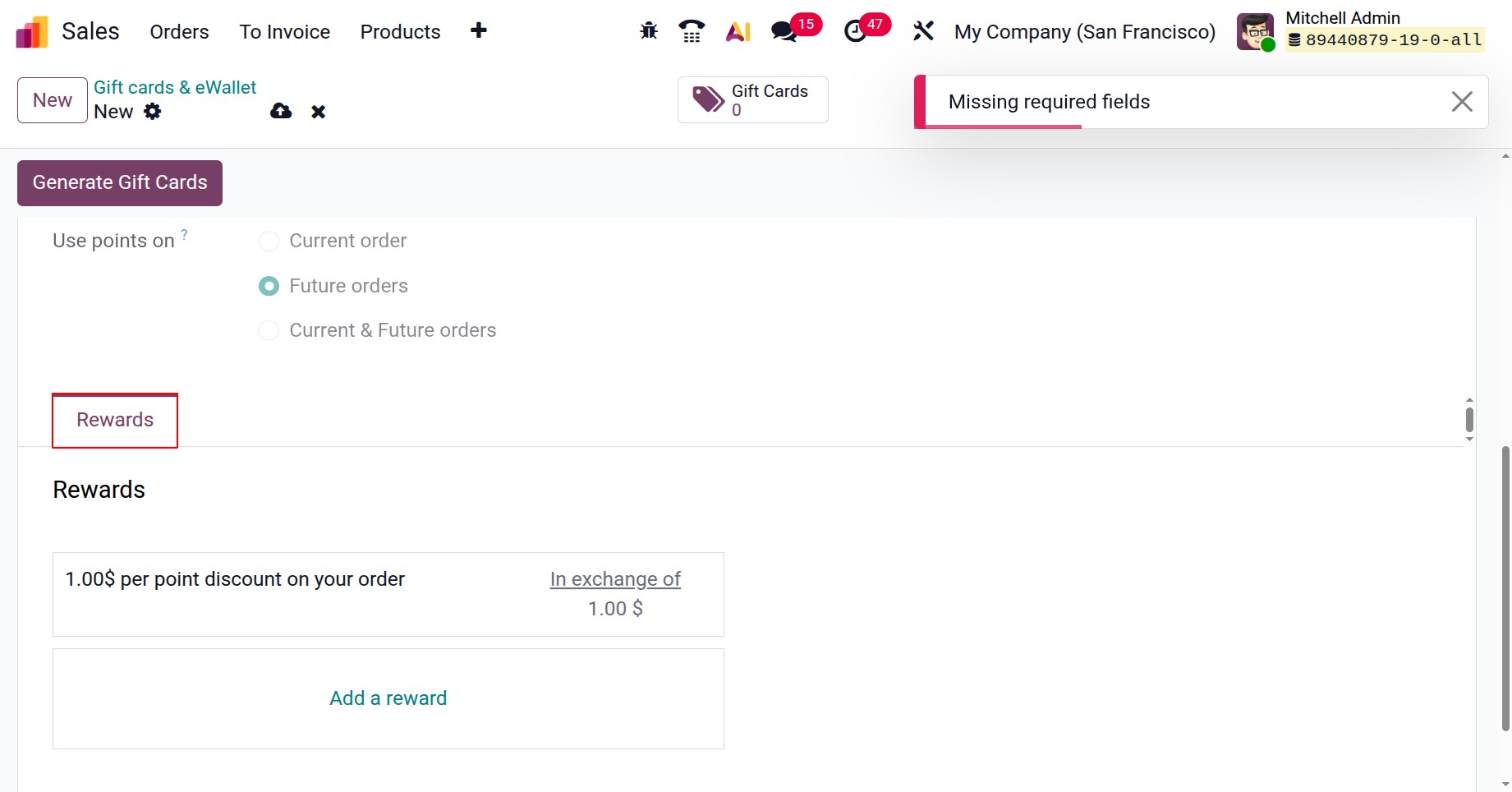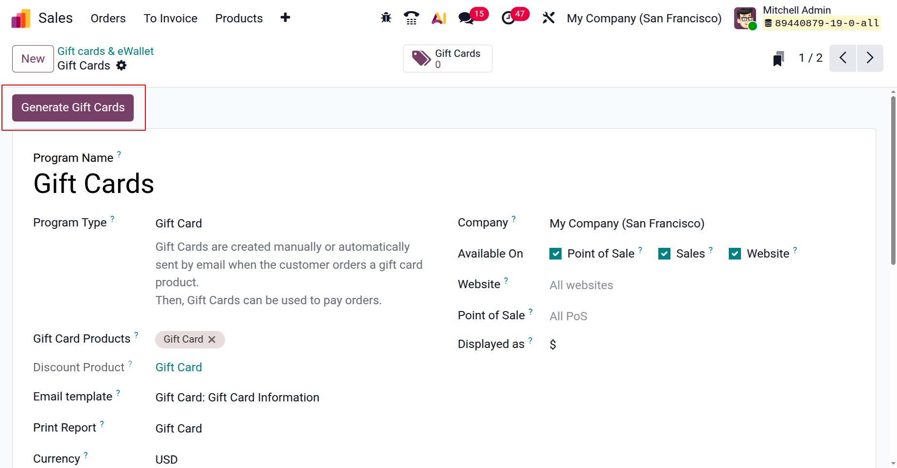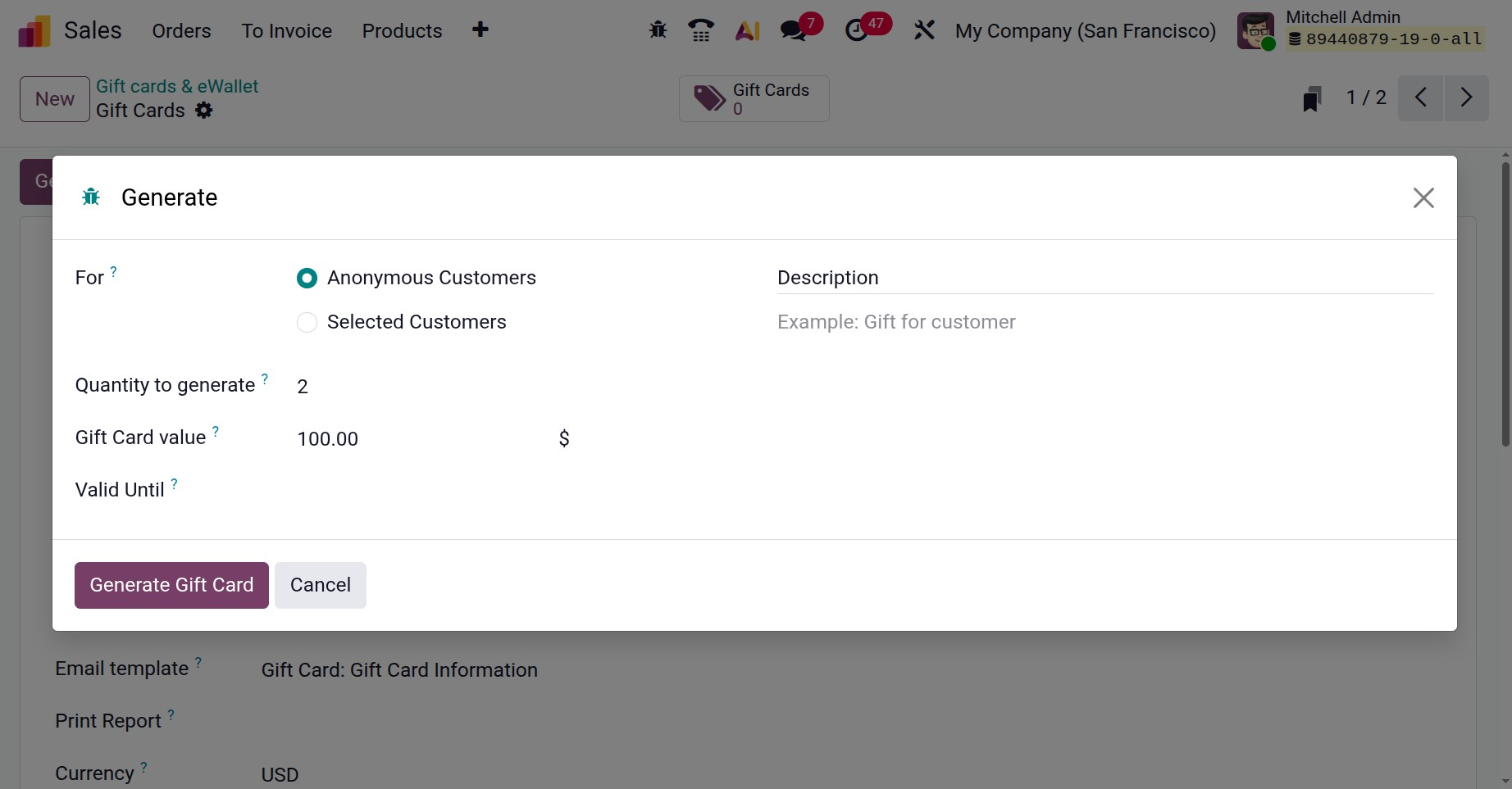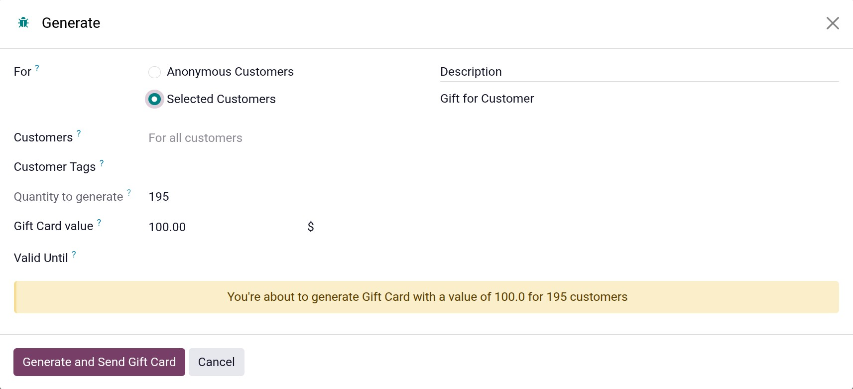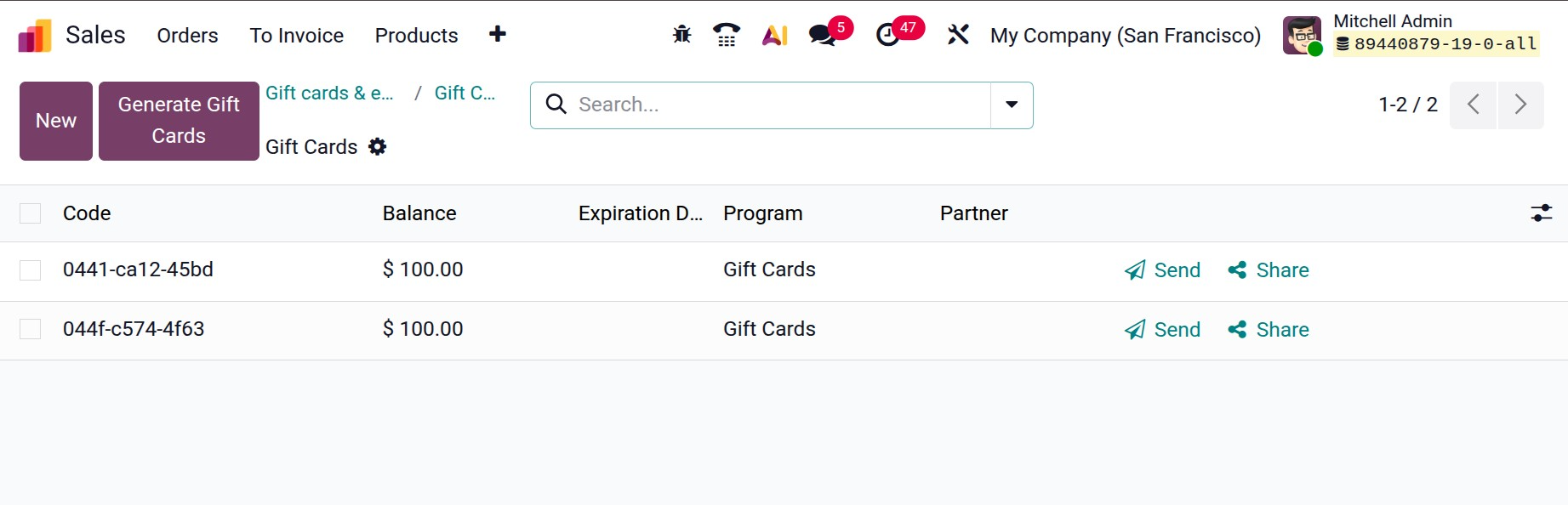 Next, click the "Generate and Send Gift Card" option to create a large number of gift cards based on the number provided. At the top, there will be a smart tab for gift cards.The Gift Cards smart button in the top-right corner provides access to generated gift cards. The gift cards can then be sent or shared by email or a URL link.