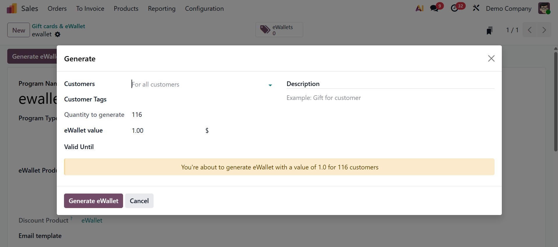 Finally, go for the Generate eWallet option, and then, you can have the smart button of the generated ewallet.