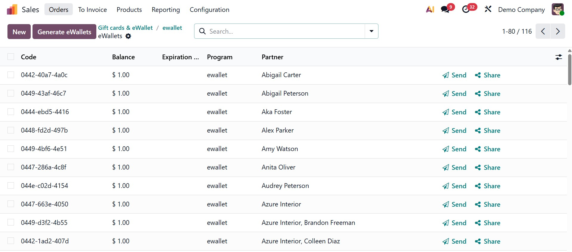 Here, as we have created ewalltes for all the customers, you can see the list here. Here. you have the send and share icon, which helps you to send the ewallet to the required one and can share it as well. On selecting a particular one, you can have a detailed analysis of the ewallet here.