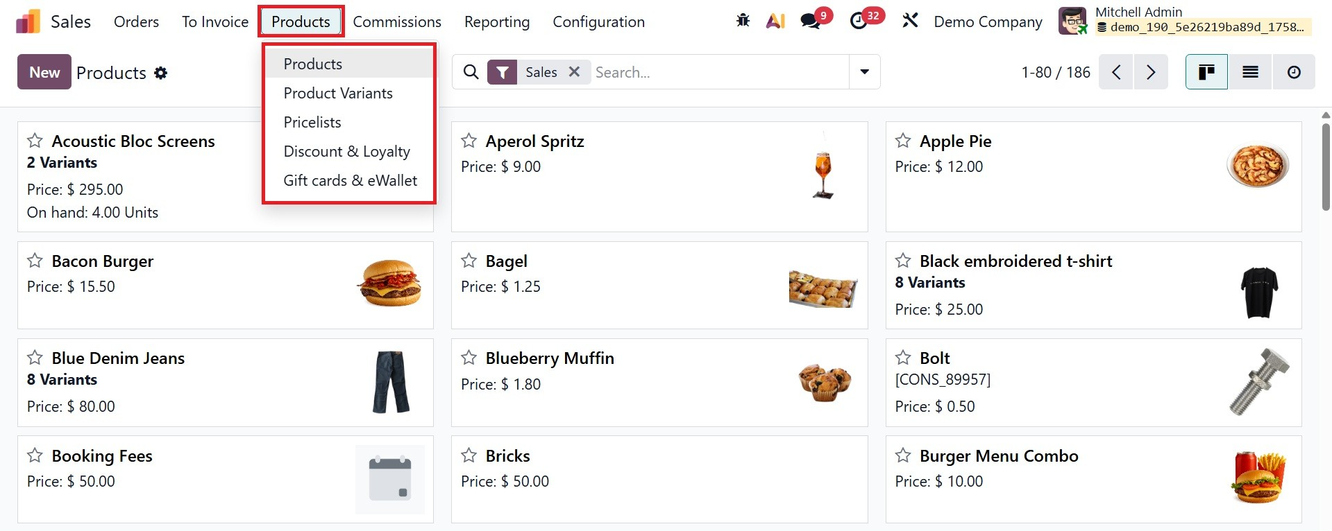 The Odoo 19 Sales module's main menu bar will show the Products menu. It contains submenus for items such as Price lists, Product Variants, Discount and Loyalty, gift cards, and e-wallets.