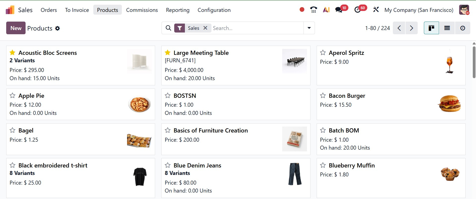 When you select the items submenu in Odoo19, a list of all the configured items in the Sales module will appear in a new window. This window supports the List view, activity view, as well as Kanban view. The following screenshot displays the Kanban view in the product management window.