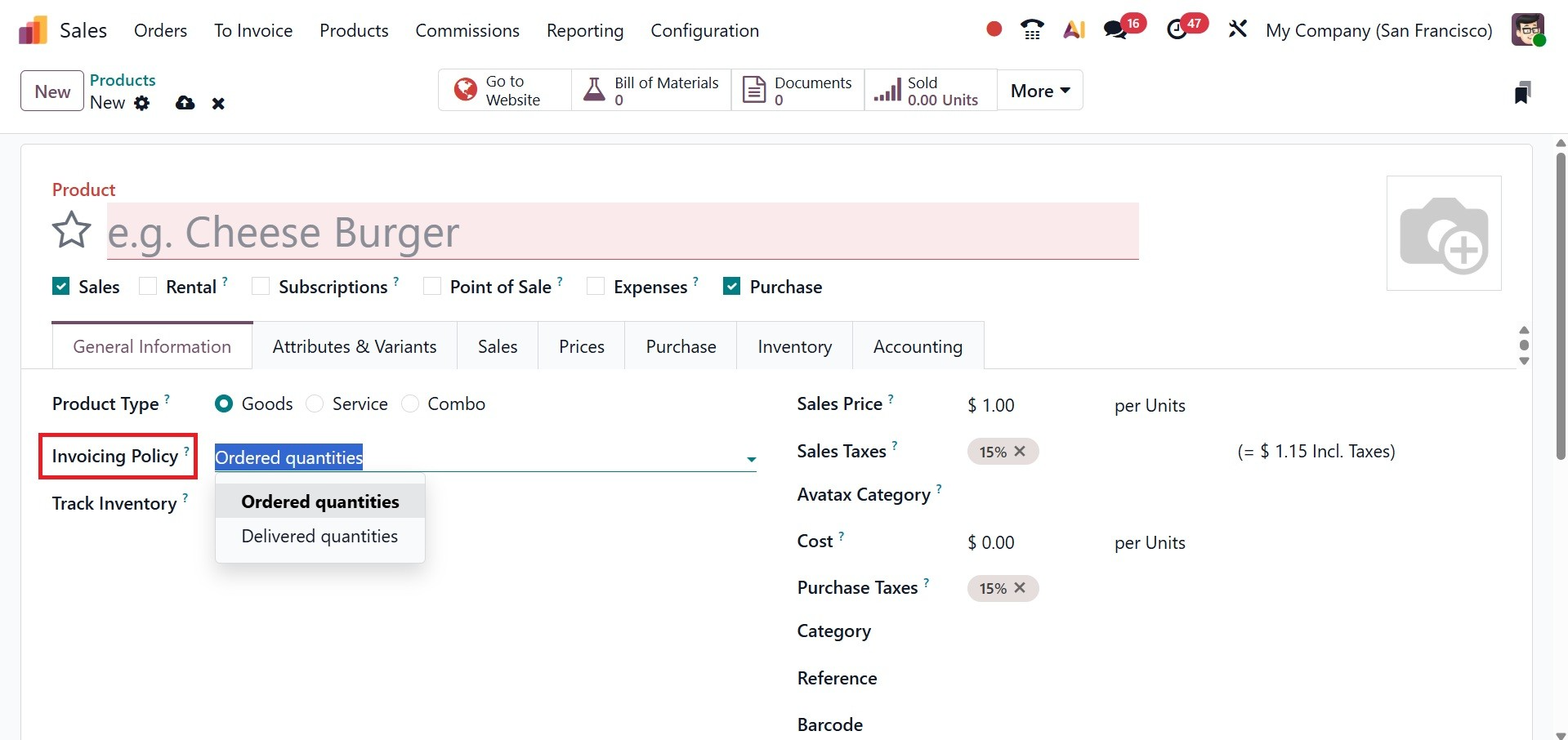 - Ordered Quantities:Odoo will enable you to create invoices prior to delivery if you have chosen this invoicing policy.