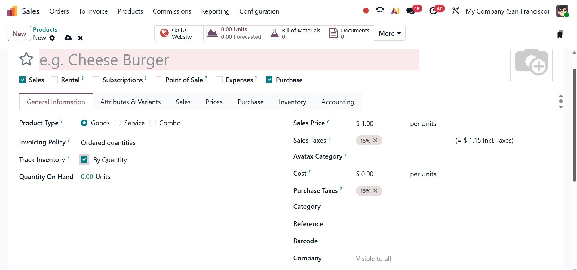 You Track inventory option is the checkbox which determines whether Odoo tracks inventory for this product. The Quantity on hand, Sales price, Sales taxes, Avatax Category, Cost, Product Taxes, Category, Category, Reference, Barcode, and Company details can all be entered in the appropriate areas.