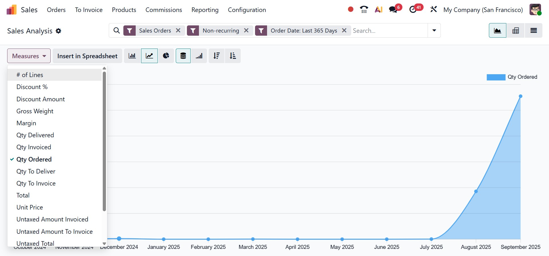 The Measures option in the Sales Analysis view allows you to choose particular data categories for analysis from a dropdown list.