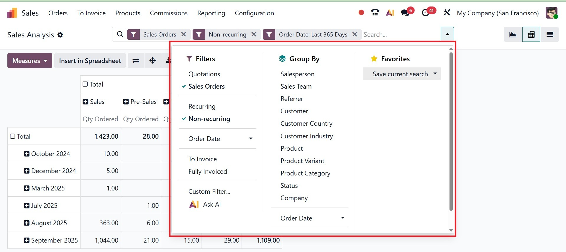 The module makes it possible to customize reports to meet certain requirements by using grouping options and filters. To examine sales patterns and pinpoint high- or low-performing products, users can, for instance, filter sales data by product, product category, or time period. Furthermore, the reports can be seen in a variety of formats, including pivot tables and graphical representations (bar, line, or pie charts), which facilitate data interpretation and actionable activities.