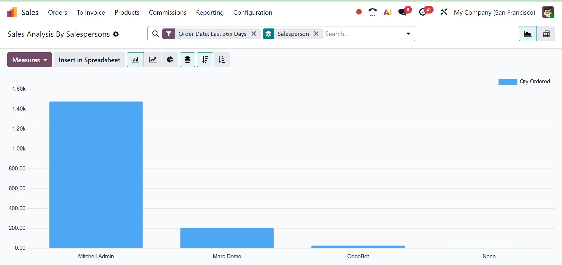 Go to the Sales module and choose the Reporting tab to use this feature. You can alter the data in the Sales Analysis By Salespersons pane to highlight particular salespeople. To see data broken down by specific sales representatives, use the Group By option and choose the Salesperson option. The study can be further refined by adding other criteria, like date ranges or particular sales orders.