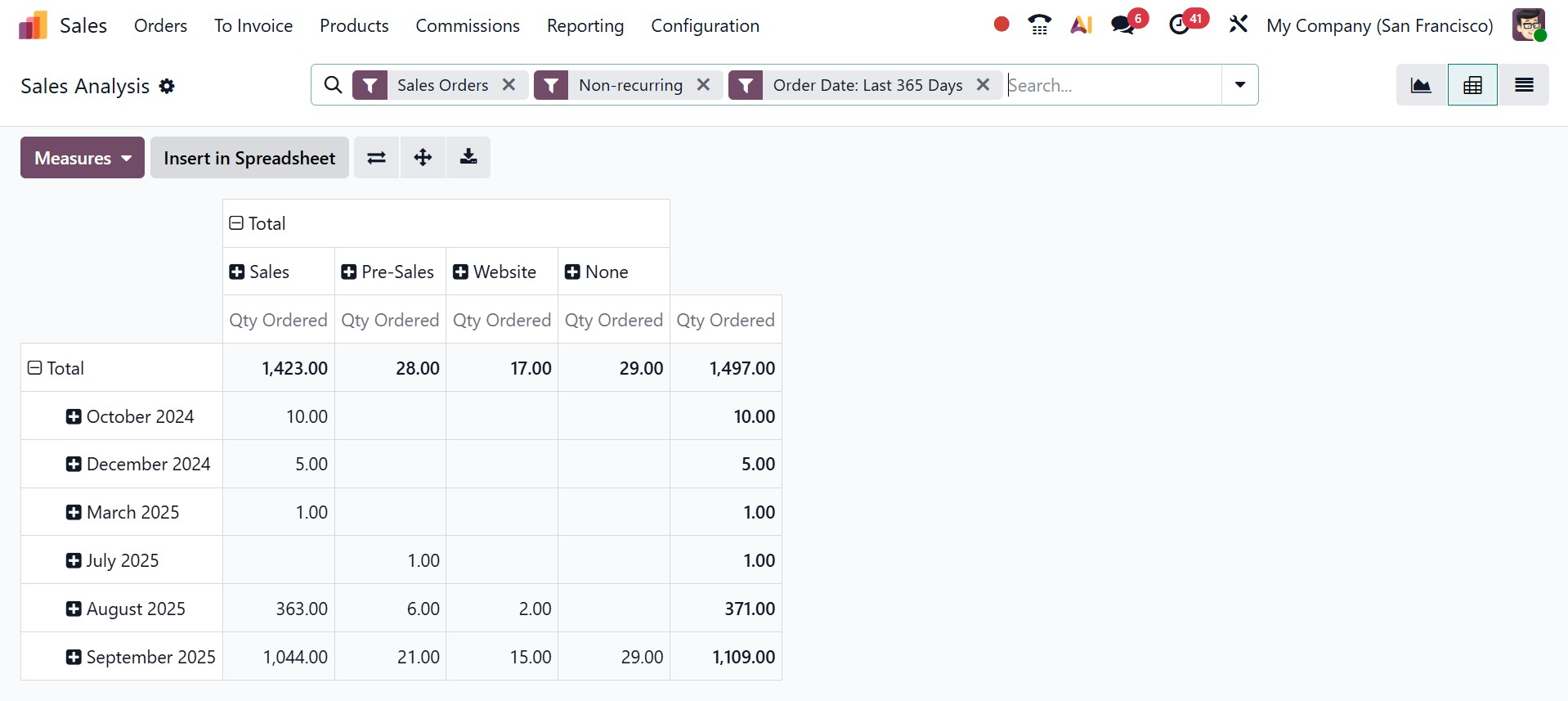 Your sales report is shown in tabular form in the Pivot view, which facilitates extensive data analysis. Furthermore, you can export the data to an Excel file using the Download xlsx tool and flip the axes for improved viewing with the Flip Axis icon. For a more thorough inspection, you can drill down into the records' specifics using the Expand all option. With the ability to filter data for particular days, weeks, months, or years, filters further improve reporting capabilities by enabling you to create sales reports based on Order Date, as in the image below.