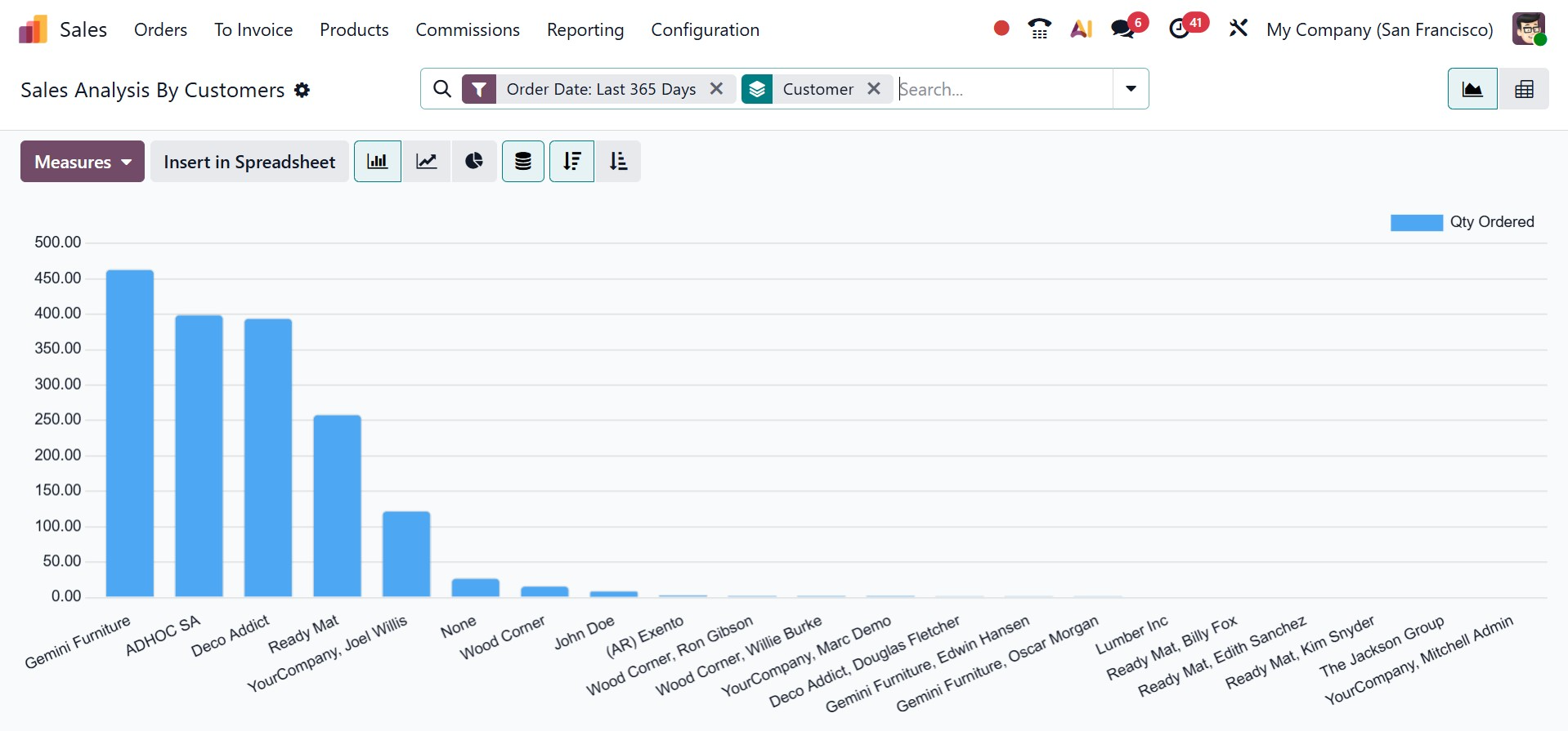 Businesses can assess customer-specific sales success by using the Odoo Sales module's sales analysis feature, which gives them vital information about revenue contribution, client value, and purchase trends. Users can examine sales trends and pinpoint important accounts by accessing comprehensive reports that are filtered by customer, by going to the Reporting tab in the Sales module.