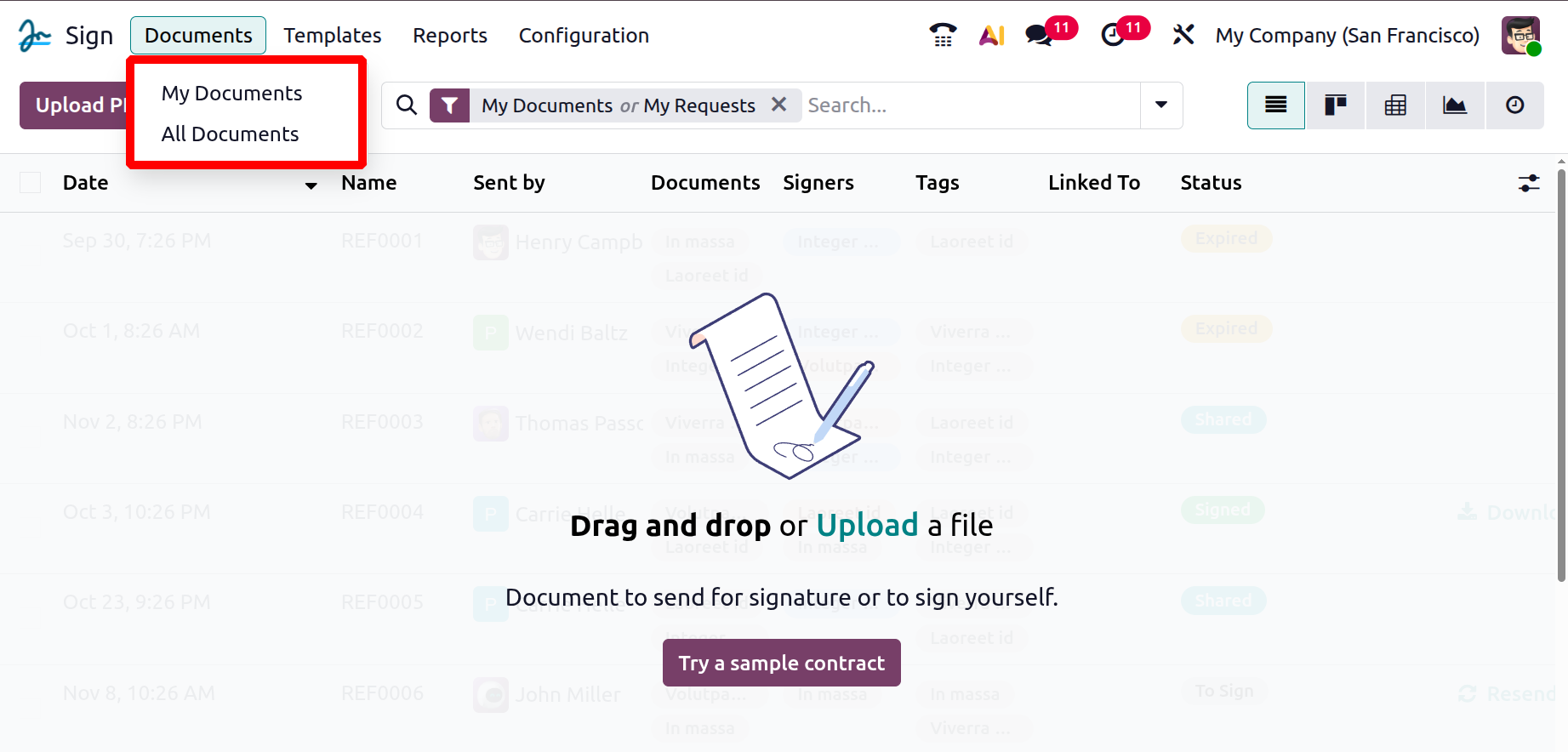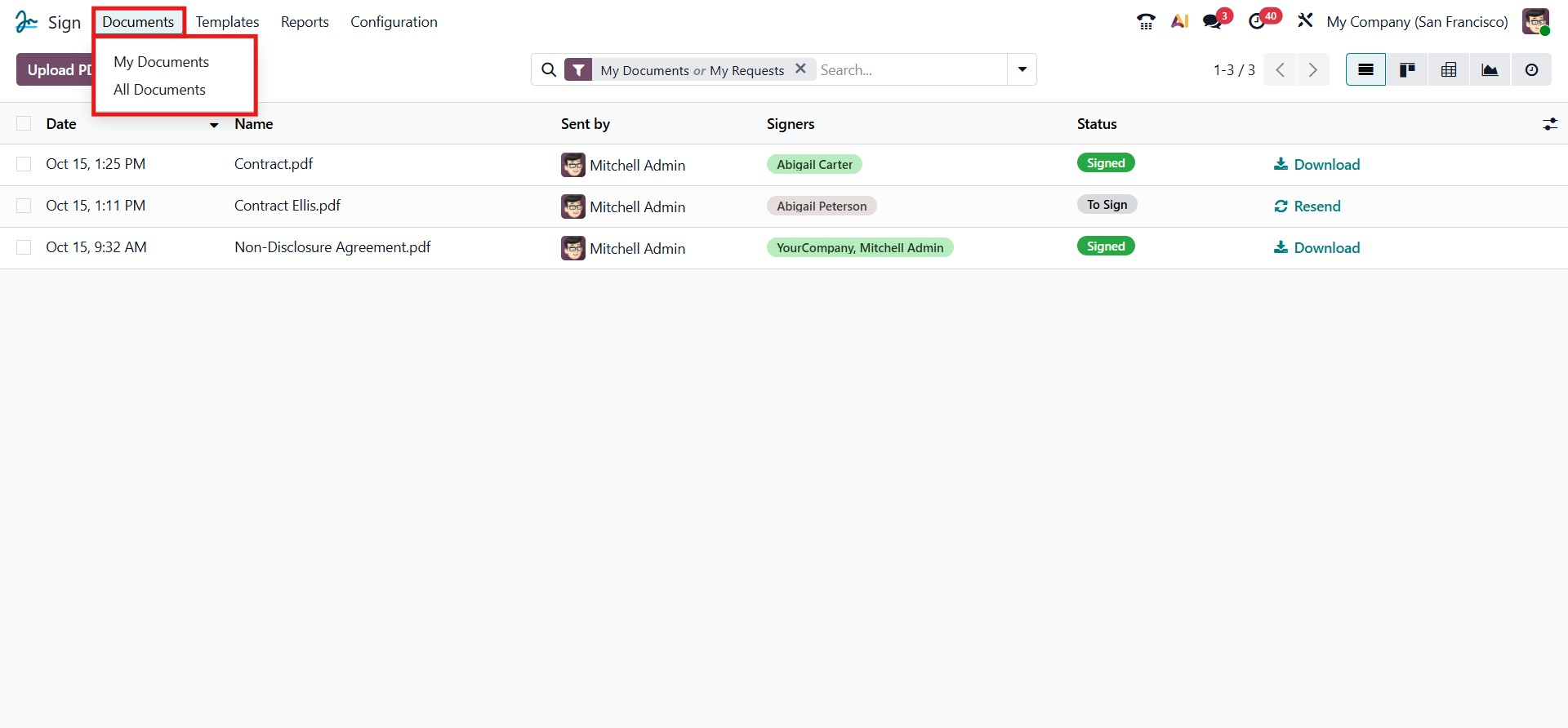 The Documents tab in the Odoo 19 Sign module opens the main Documents window, which serves as the central hub for managing all documents sent out for signatures.