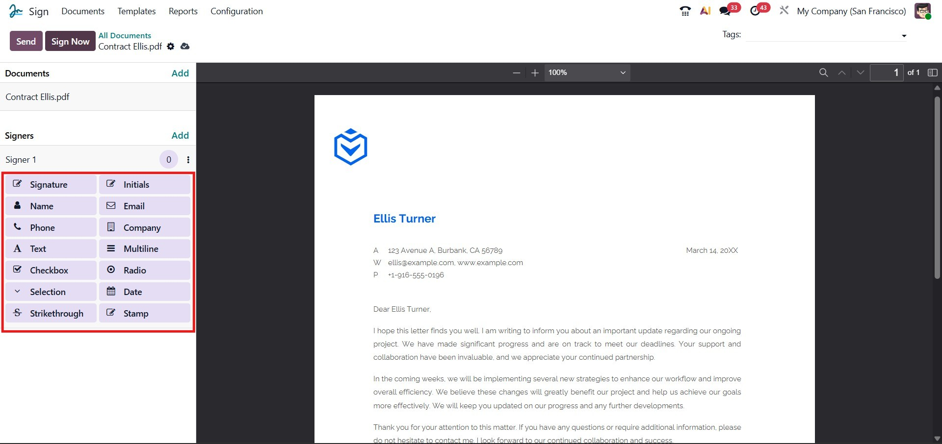 Odoo 19 introduces an enhanced collection of predefined fields that can be inserted into your document for signing and data collection. These include Signature, Initials, Name, Email, Phone, Company, Text, Multiline, Checkbox, Radio, Selection, Date, Strikethrough, and Stamp. Each of these elements can be easily dragged and dropped from the left-hand panel onto the desired area of your PDF.