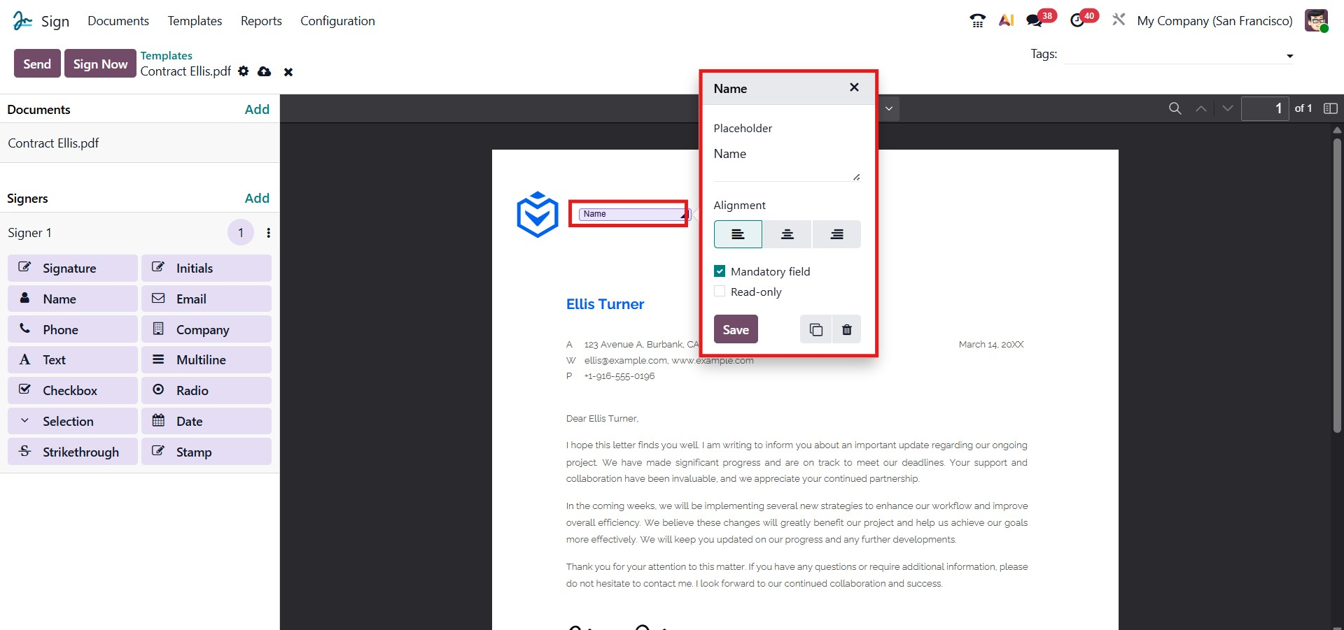 The field can be freely resized or repositioned anywhere on the document to match your layout preferences. You can repeat the same process for other fields, such as Signature, Date, Company, or Email, depending on the type of information you want to collect. After filling in and adjusting all mandatory fields, click Save again to confirm the updates.