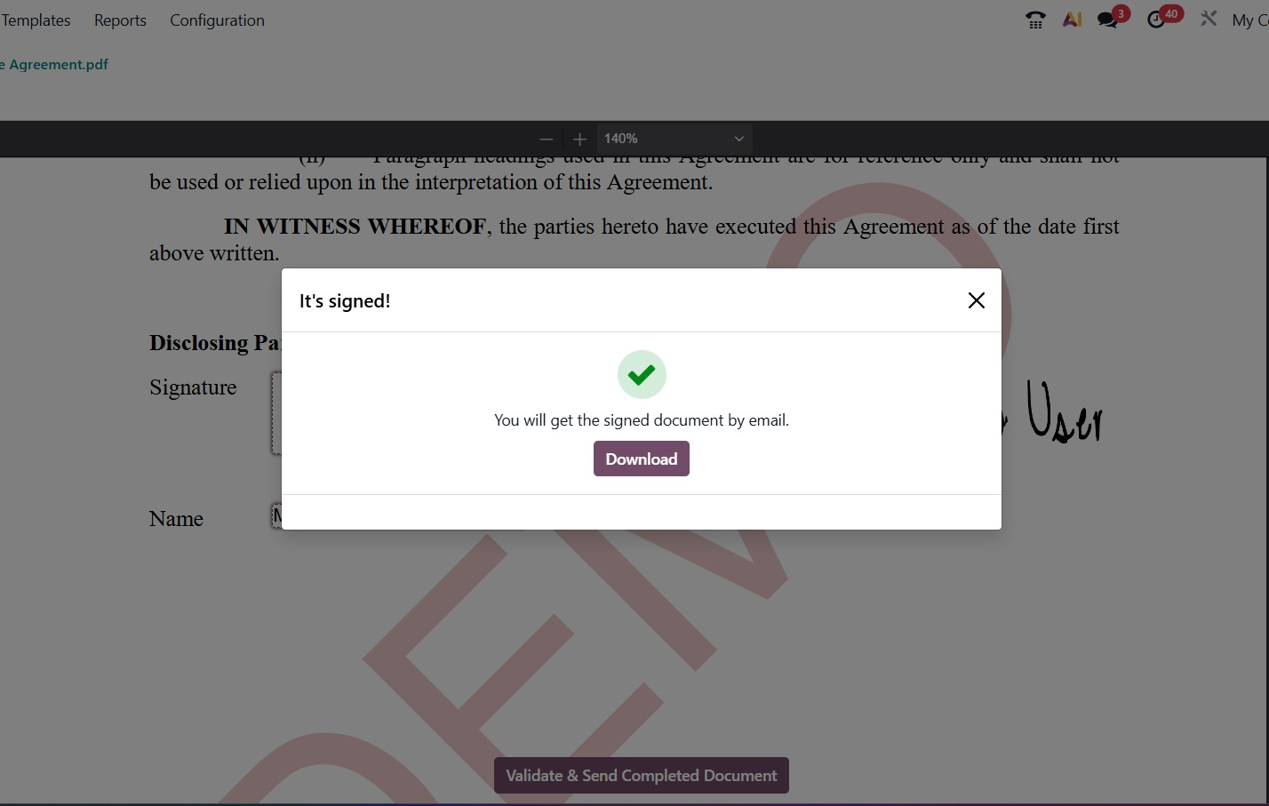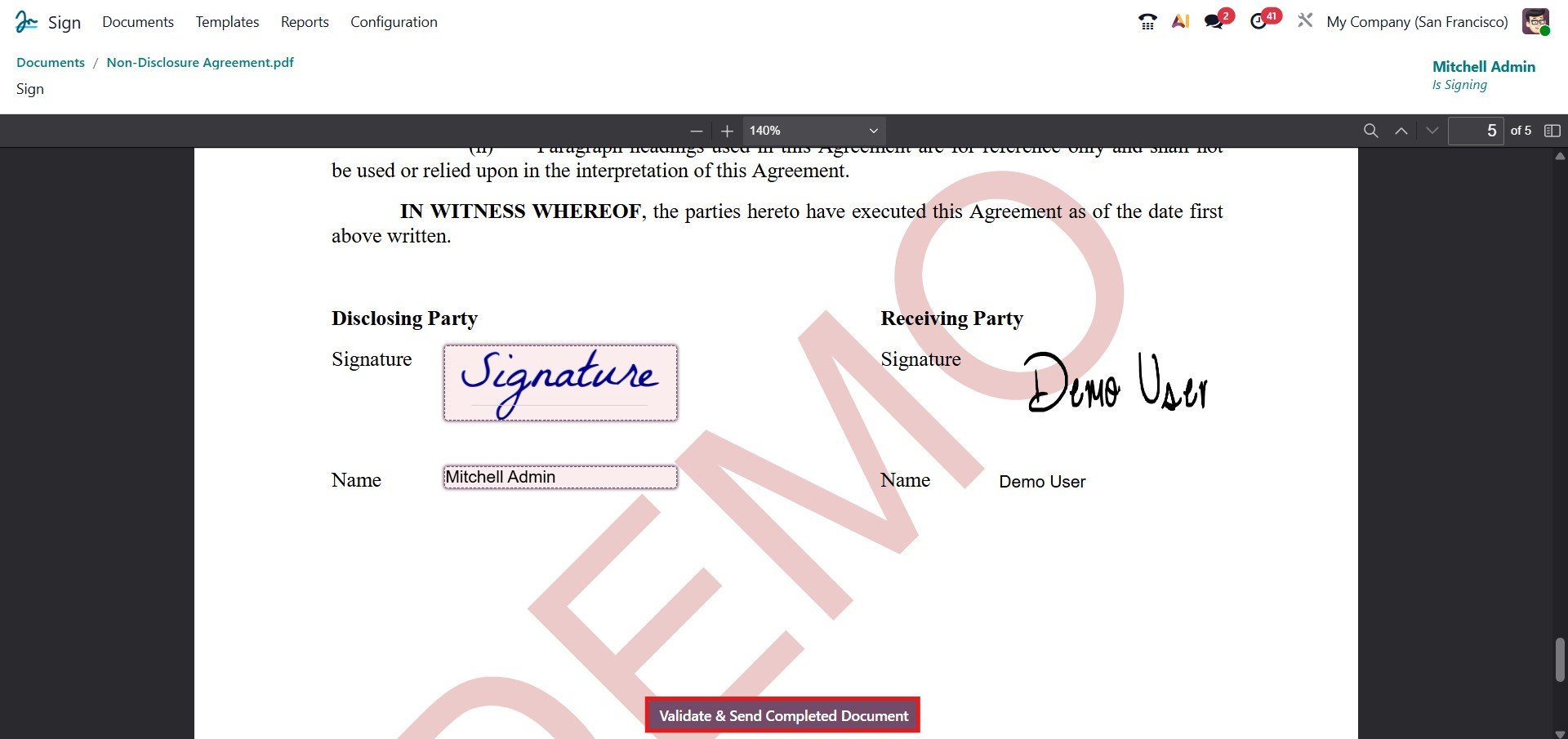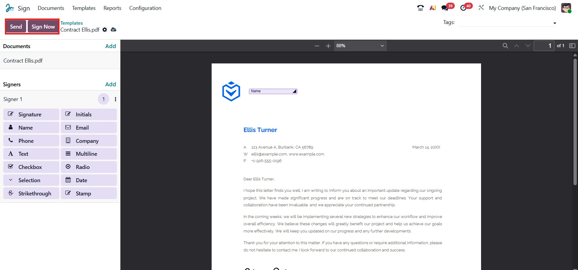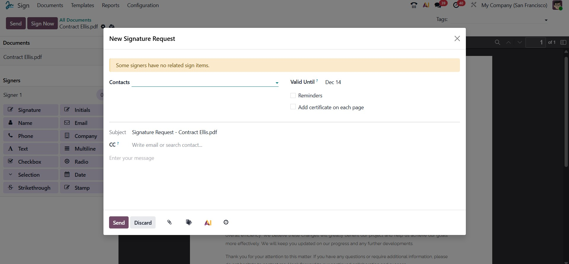 The Send button allows you to share the document with the intended recipient for their review and signature. You can specify the recipient’s email address, and Odoo will automatically send the document link for signing. This ensures a smooth and secure document-sharing process.