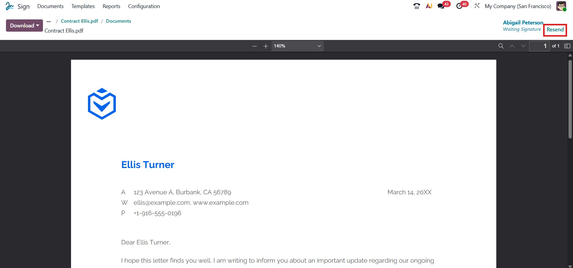 If any of the recipients fail to respond to the signature request within the specified time, Odoo allows you to resend the invitation without creating a new request. By clicking the Resend button located in the upper-right corner of the window, you can easily send the invitation again to the concerned signers. This ensures that all participants are reminded to complete their signatures promptly and helps maintain the workflow without delays.