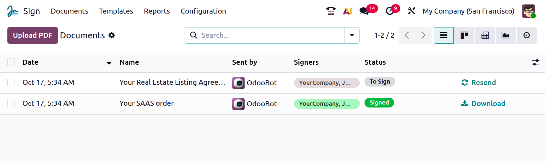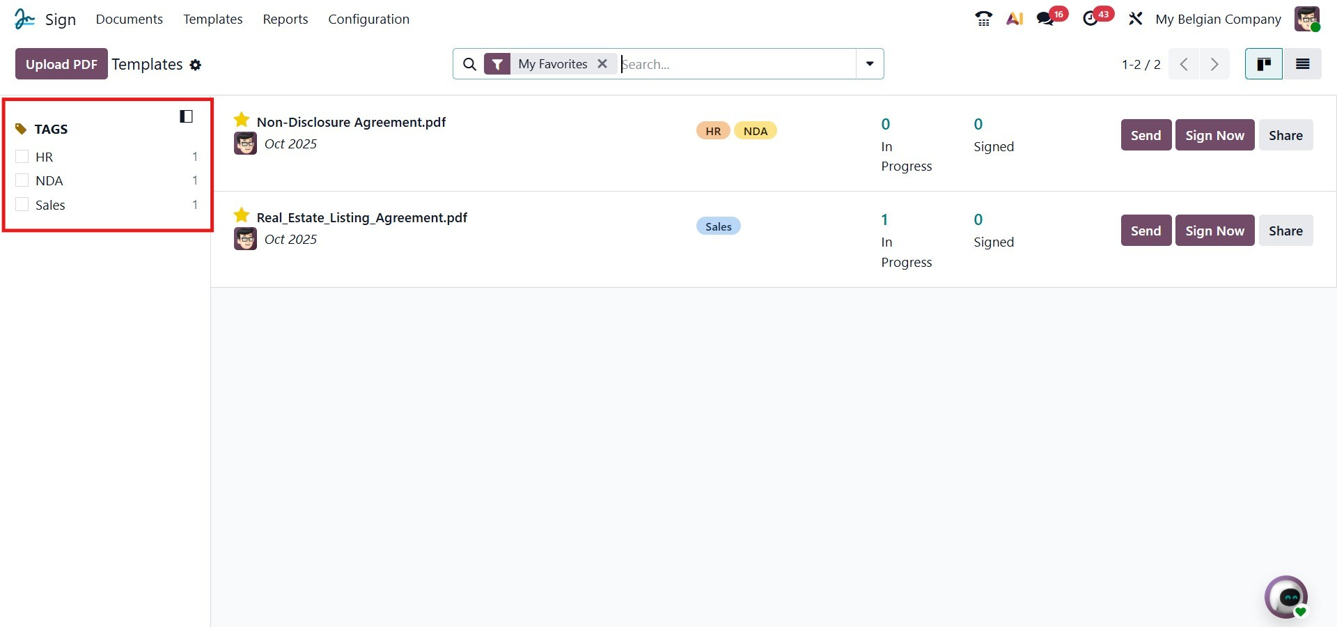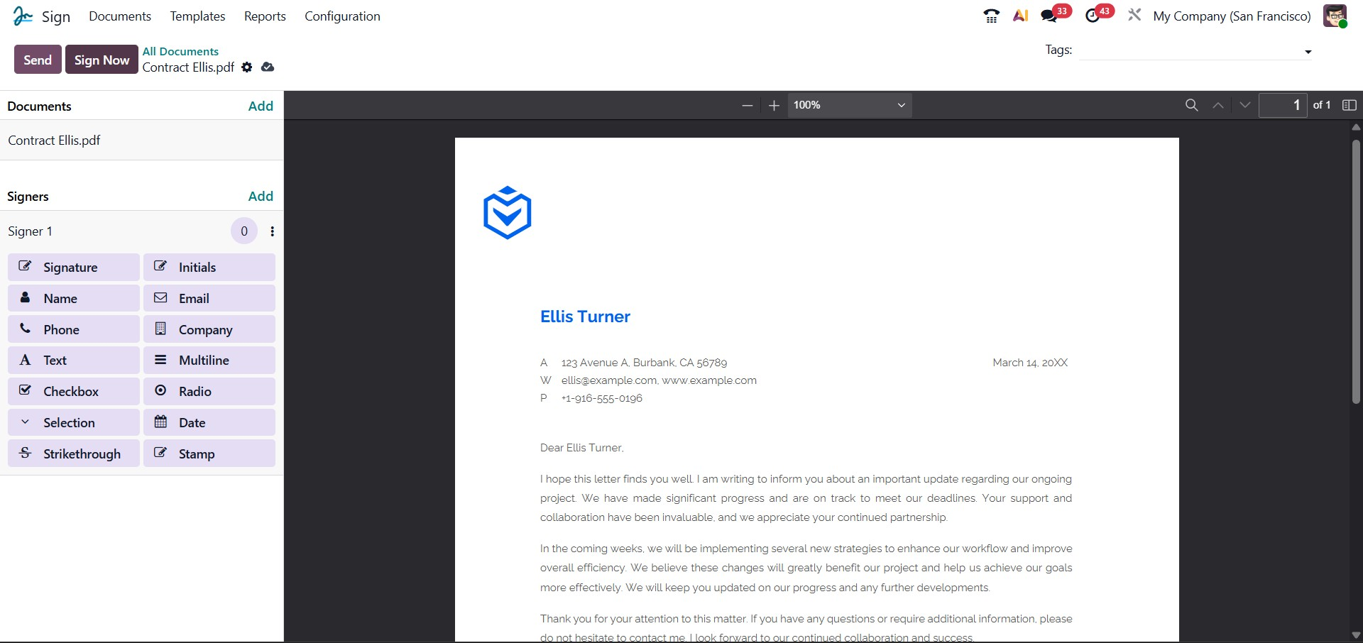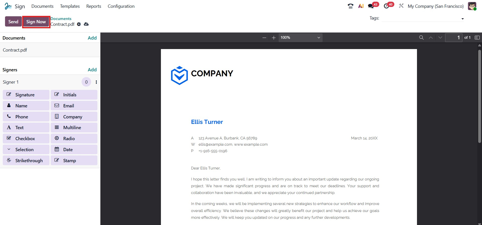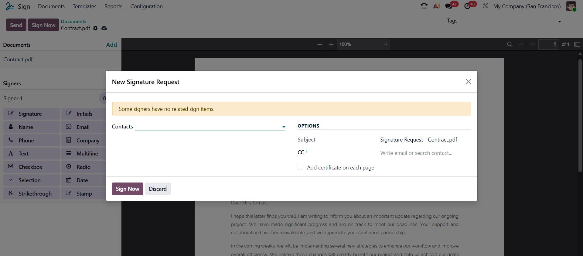 Once all the required information has been entered, click Send to dispatch the signature request. Alternatively, if you wish to sign the document immediately, you can use the Sign Now button. After the document is sent, Odoo will automatically notify you of the status of the signature request and inform you when the recipients have completed the signing process.
