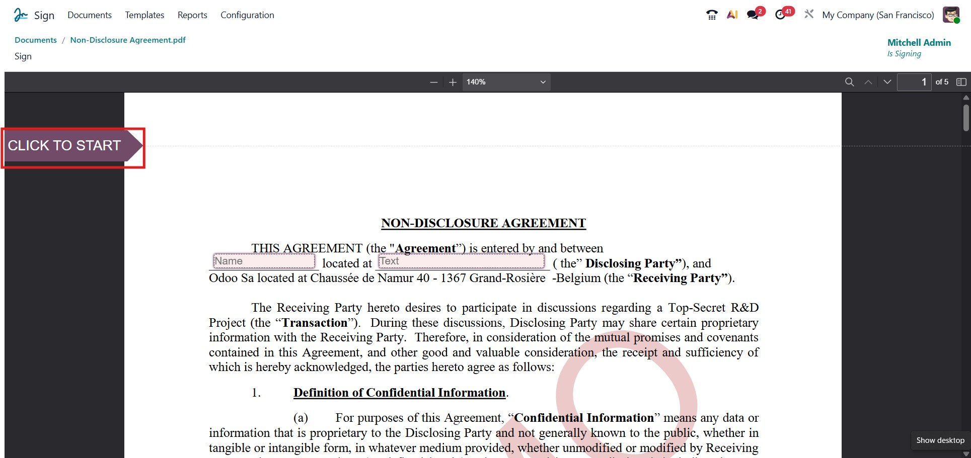 After sending or opening the document for signing, click the Click to Start button located below the document preview to begin filling in the mandatory fields. Odoo intelligently detects each required field and automatically guides you through them in sequence, ensuring that no field is overlooked during the signing process.